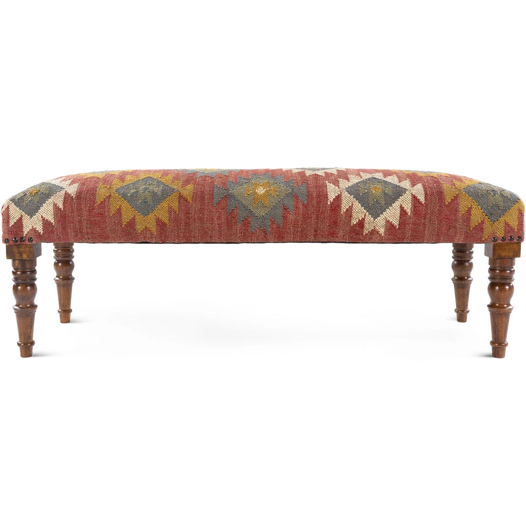 Taking cues from the intricate motifs of tribal kilim rugs, this eclectic hand woven wool and jute bench adds southwest appeal to any space.