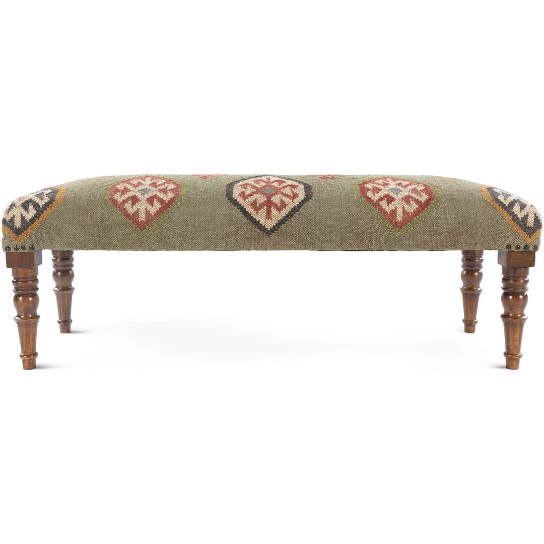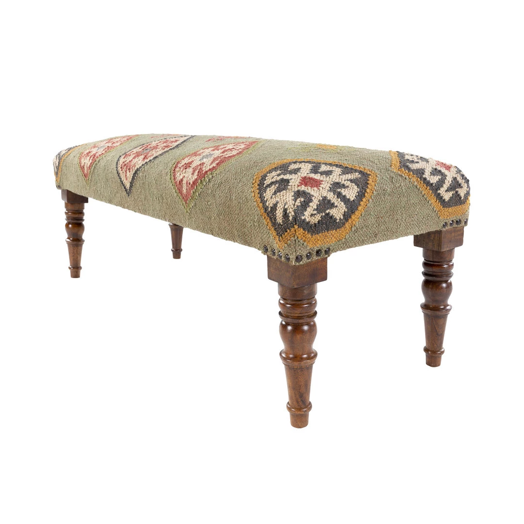 Taking cues from the intricate motifs of tribal kilim rugs, this eclectic hand woven wool and jute bench adds southwest appeal to any space.
