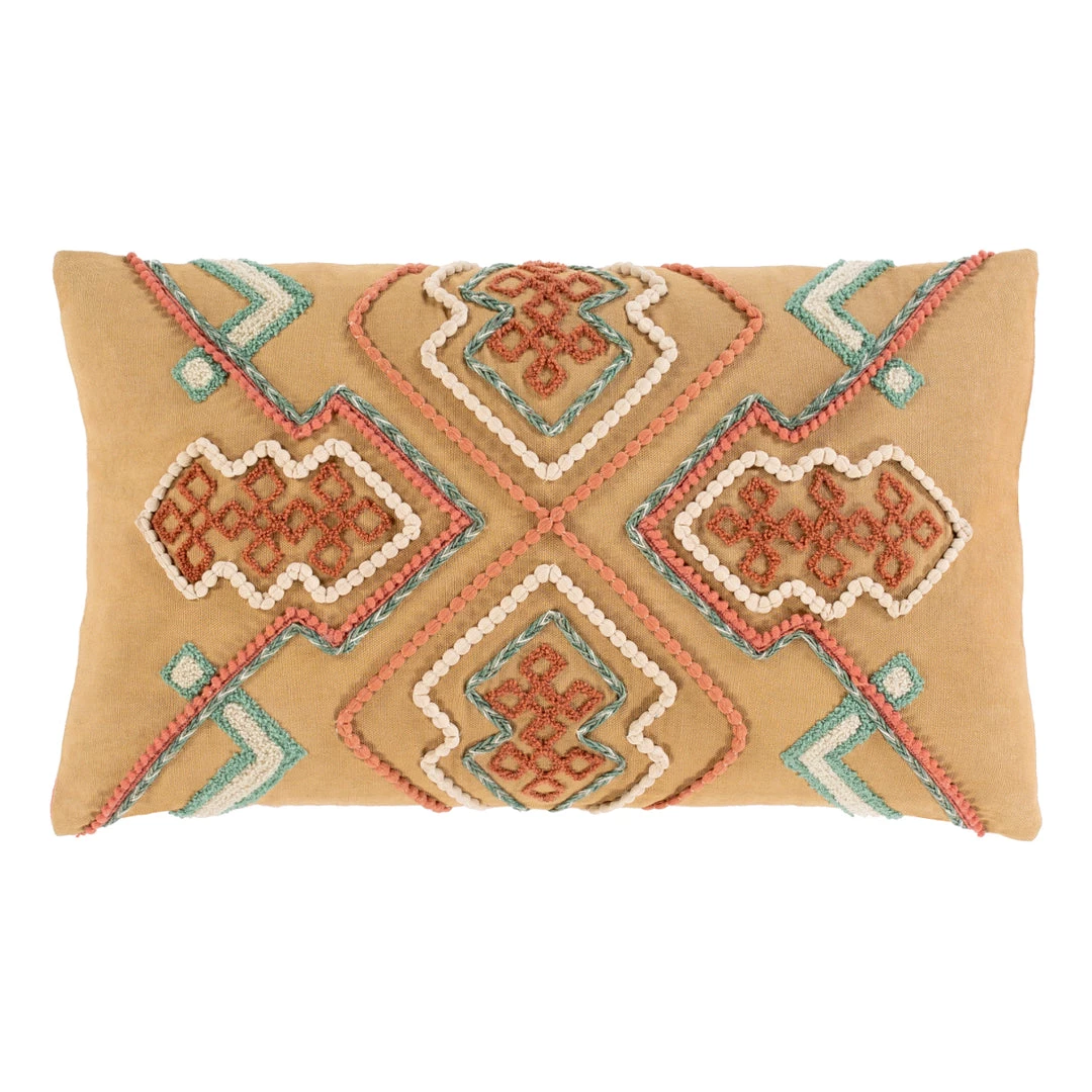 Ethnic embroidered lumbar accent pillow in desert hues.