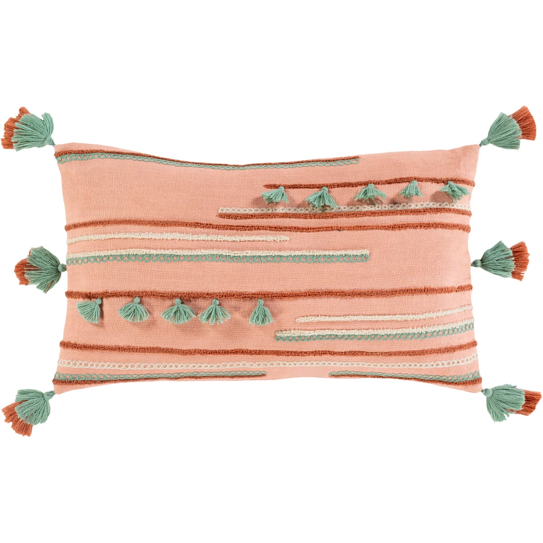 Ethnic embroidered lumbar accent pillow in desert hues with tassel detail.