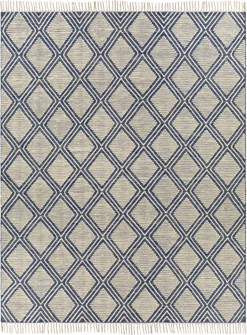 Pushing traditional flat-weaves to new heights. Its innovative high/low hand loomed texture elevates to form a pronounced pattern and faintly Moroccan style look with fringe border.