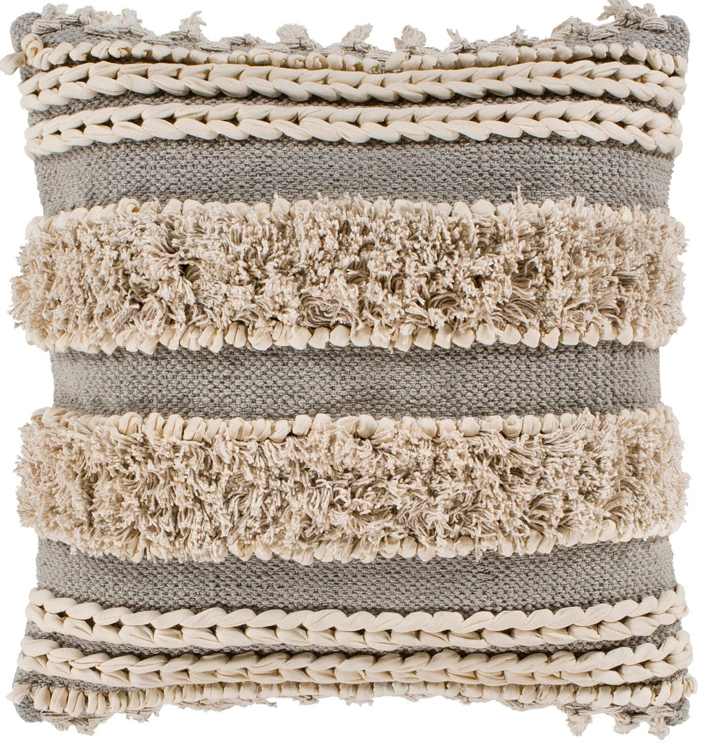 With rustic texture and tribal designs, this African safari inspired collection of pillows features shag stripes, braiding and tassel fringe detailing in nuetral and muted tones. Woven by artisans in India.
