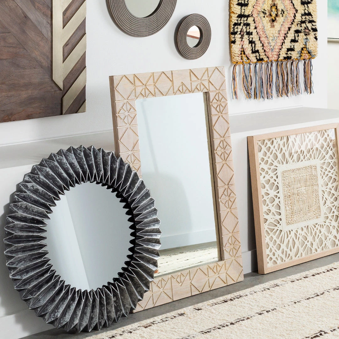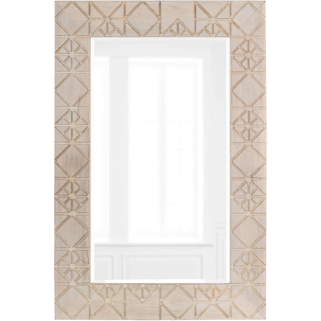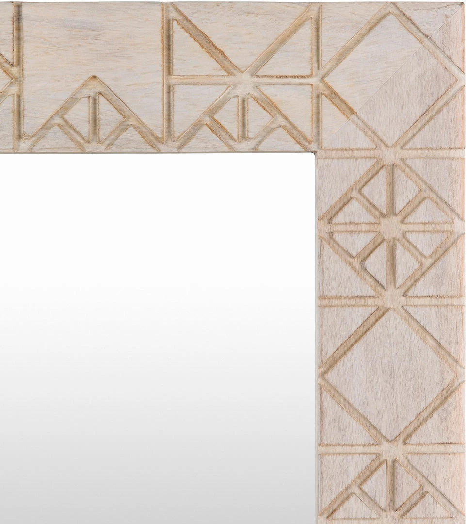 Perfectly bohemian. This tribal inspired wall mirror features a geometric hand carved border in a natural light wood finish.