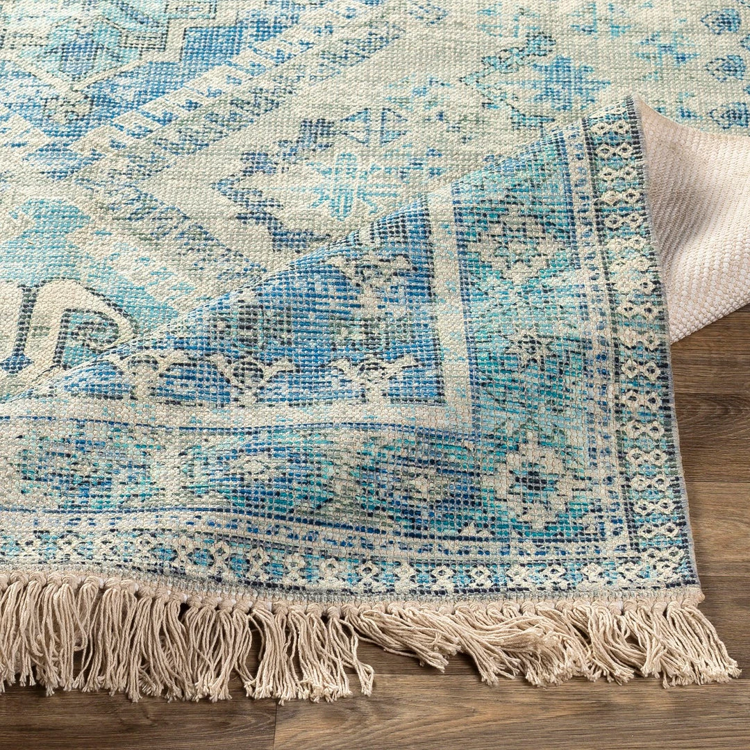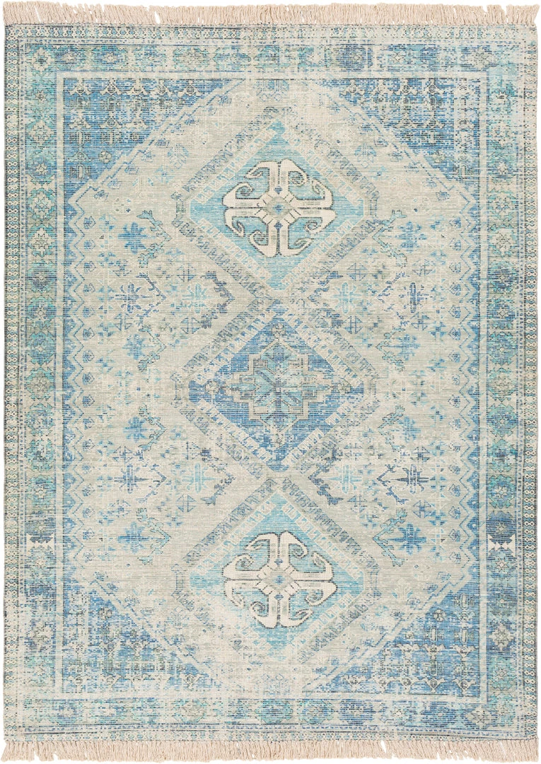 This distressed vintage print rug collection revives the antique-inspired look with a soft color palette finished with a refined fringe border.