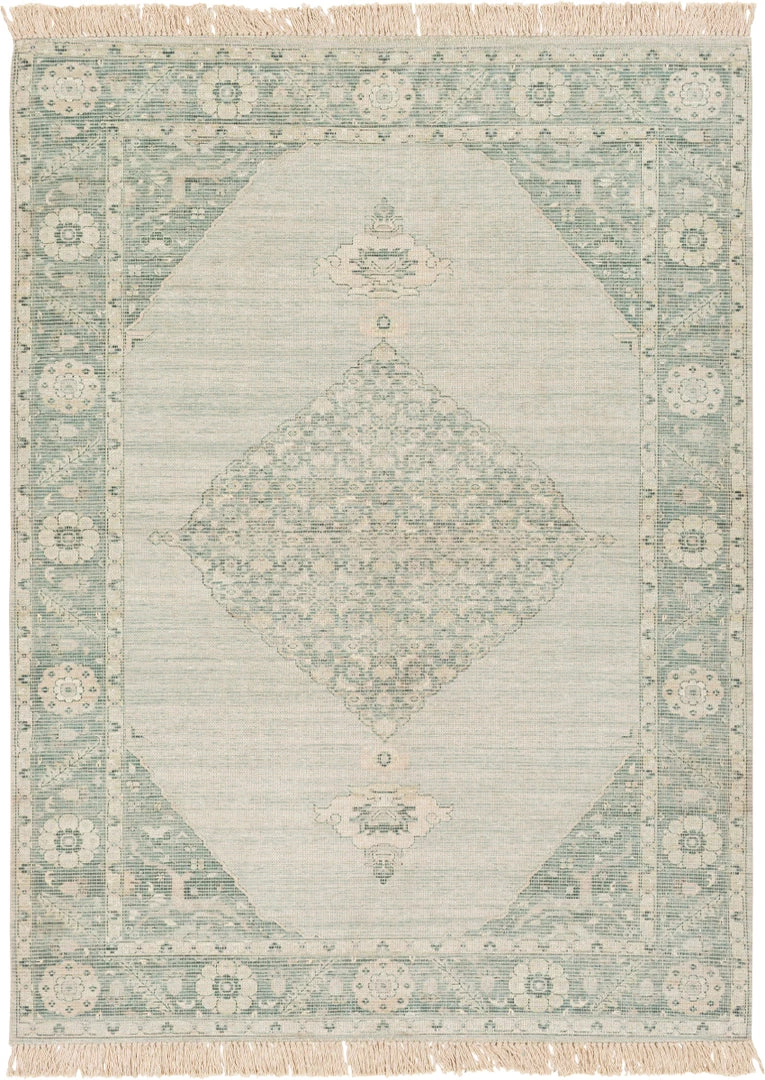 This distressed vintage print rug collection revives the antique-inspired look with a soft color palette finished with a refined fringe border.