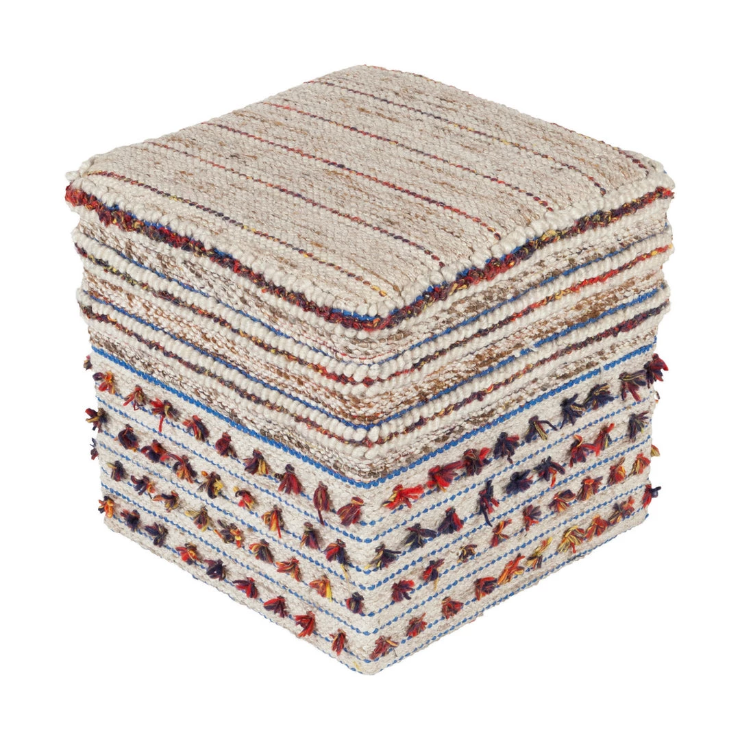 The Nordic Ottoman is woven with a viscose, wool and cotton blend with tassel detailing and various textures for a unique global style.