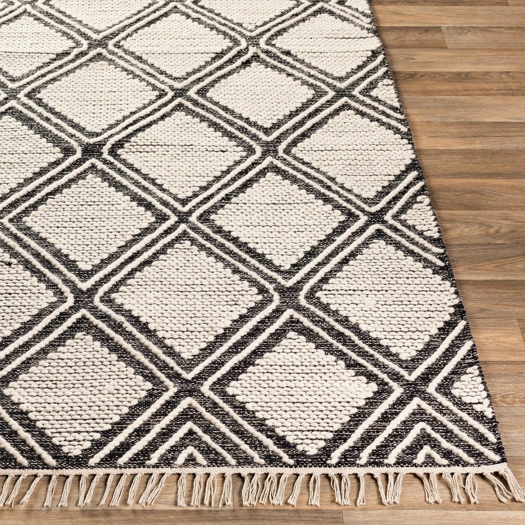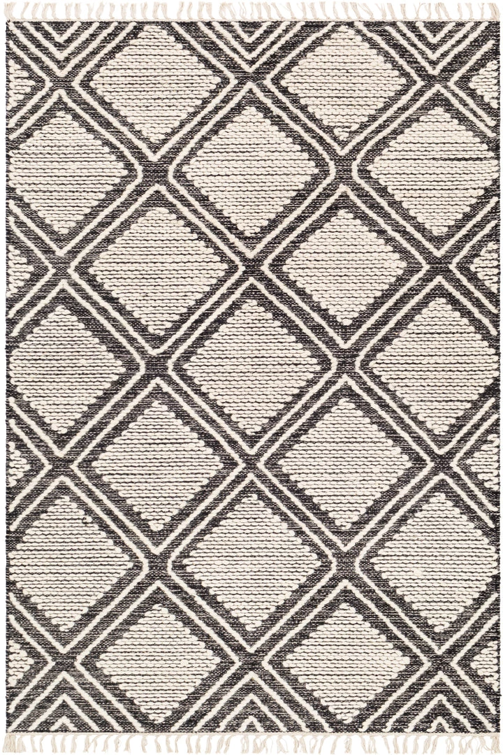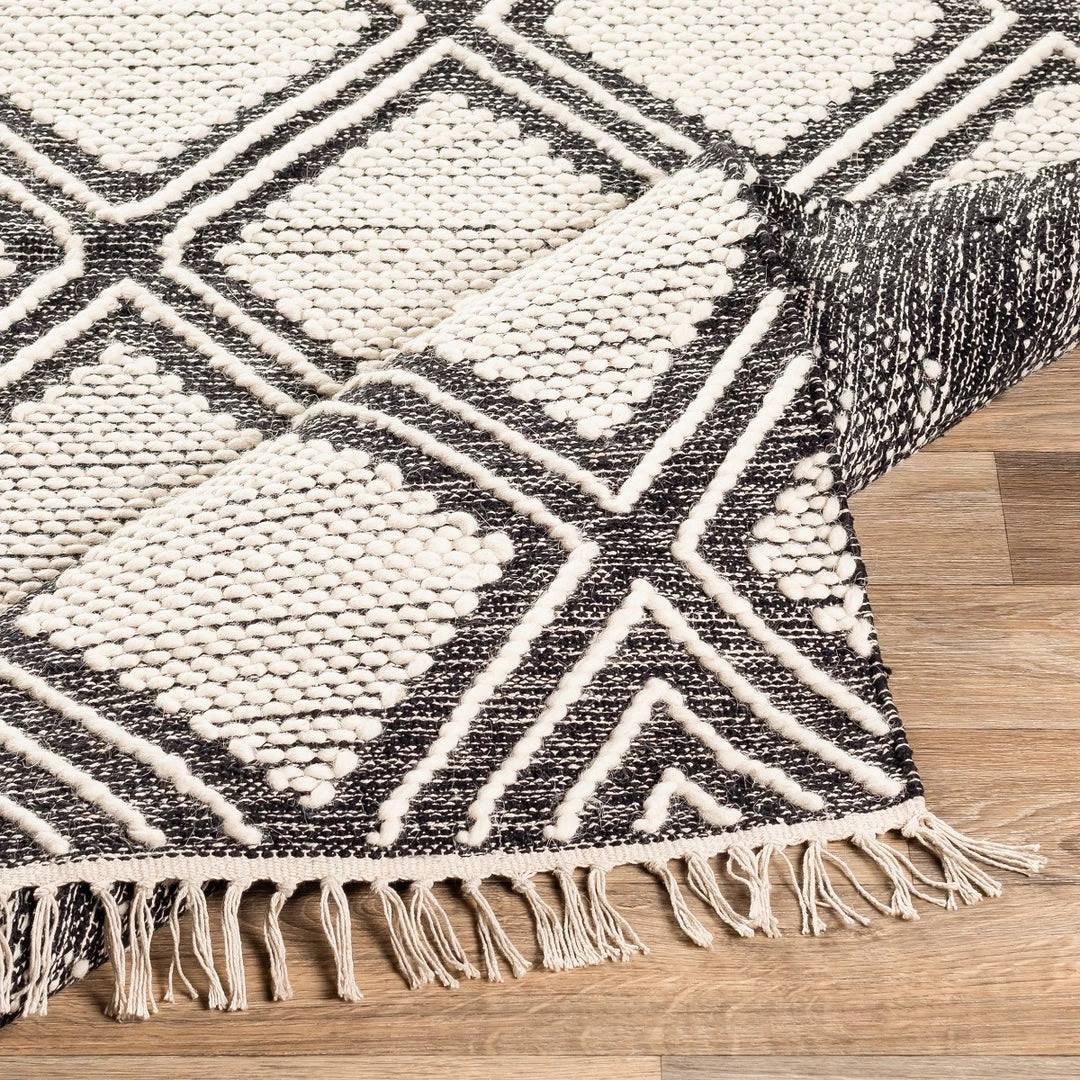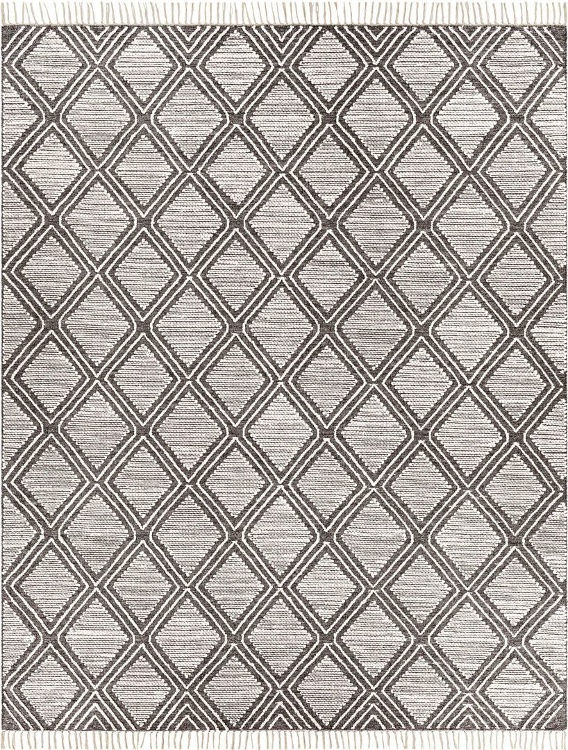 Pushing traditional flat-weaves to new heights. Its innovative high/low hand loomed texture elevates to form a pronounced pattern and faintly Moroccan style look with fringe border.