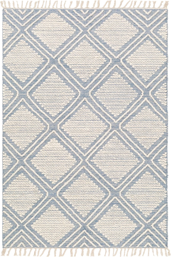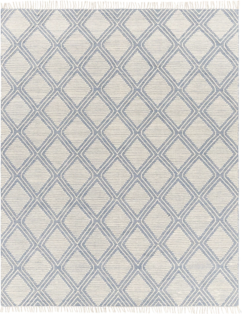Pushing traditional flat-weaves to new heights. Its innovative high/low hand loomed texture elevates to form a pronounced pattern and faintly Moroccan style look with fringe border.
