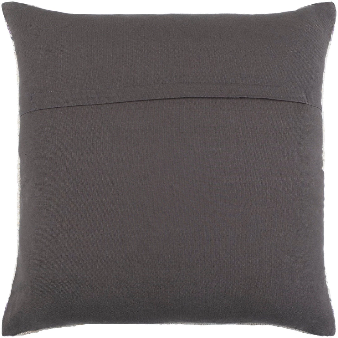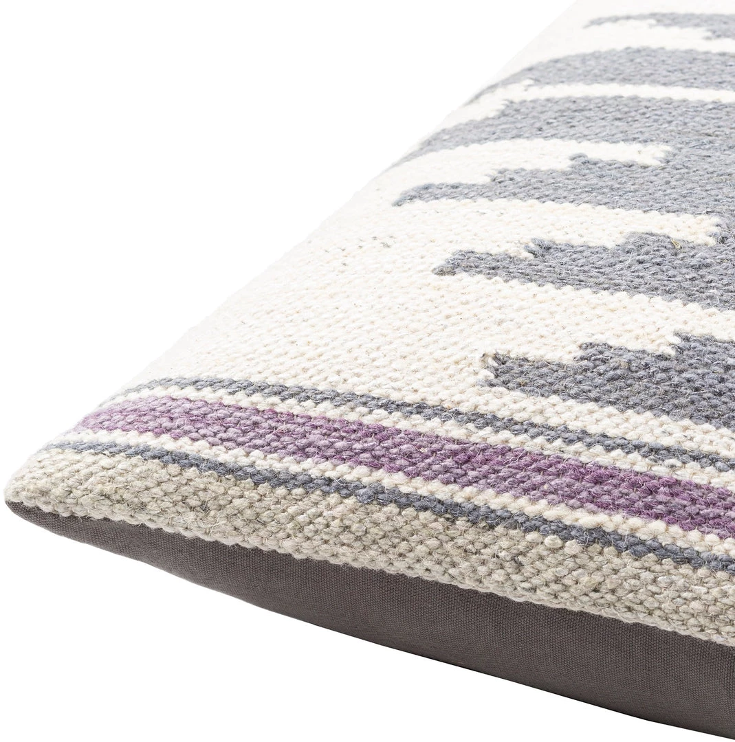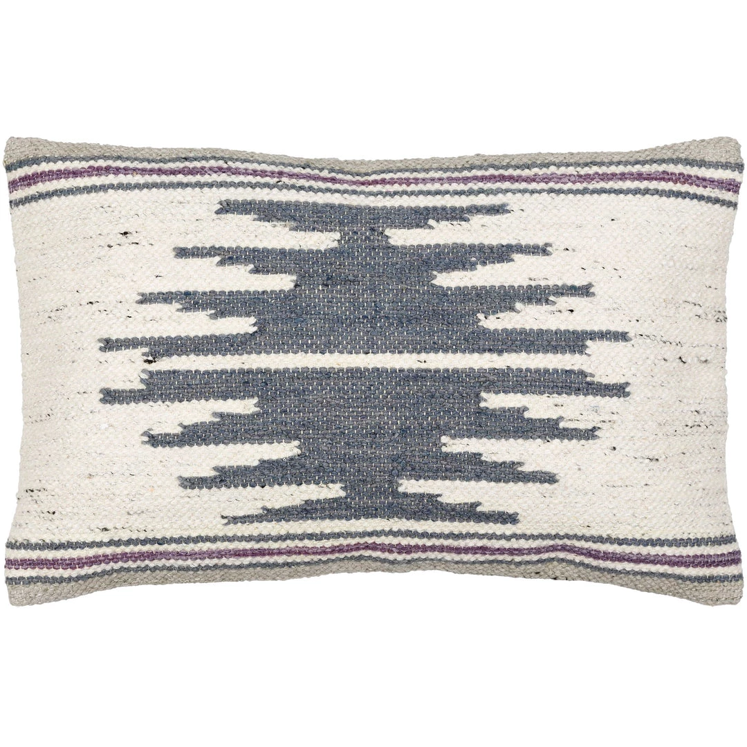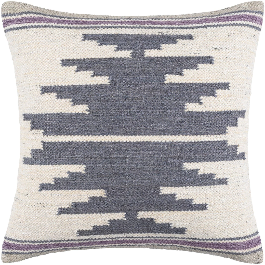 This southwest inspired pillow mixes neutral tones with denim and a bright purple stripe detail. Woven by artisans in India.