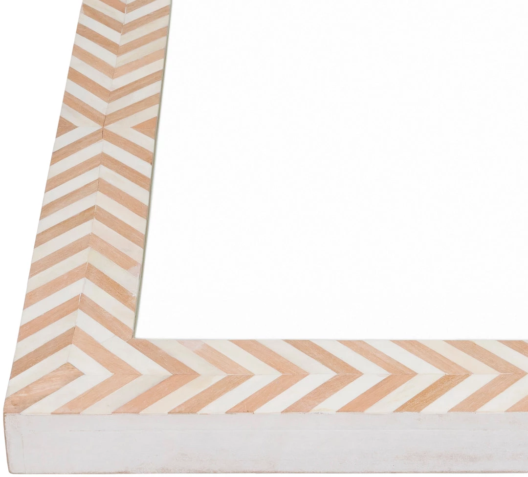 This wall mirror features alternating natural and antique white wood finishes in a chic chevron pattern. Perfect as a vanity mirror or in an entry to create a modern beach house aesthetic.