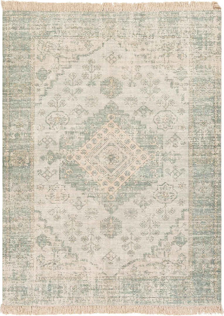 This distressed vintage print rug collection revives the antique-inspired look with a soft color palette finished with a refined fringe border.