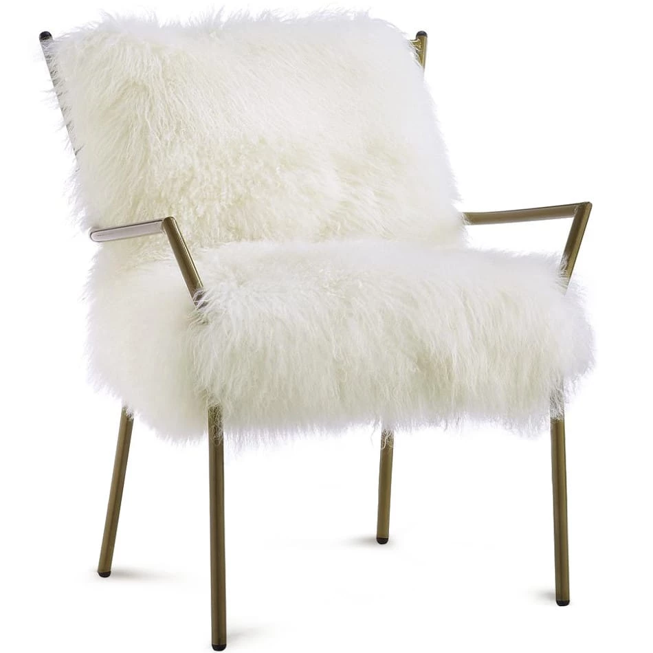 Dive into a lavish natural sheepskin with the Sherpa Shag Chair in white. The brass finished iron frame is sturdy and complements the overflowing sheepskin. A high density foam offers ample support. Available in white and gray the Sherpa Shag adds a lux look with soft modern appeal.