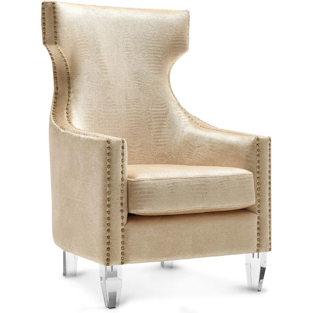 A stunning chair for a range of settings, this chair is made of hardwoods and finished in croc patterned gold velvet upholstery. The hand-applied gold nail head trim and stylish Lucite legs will give an air of extravagance to any room.