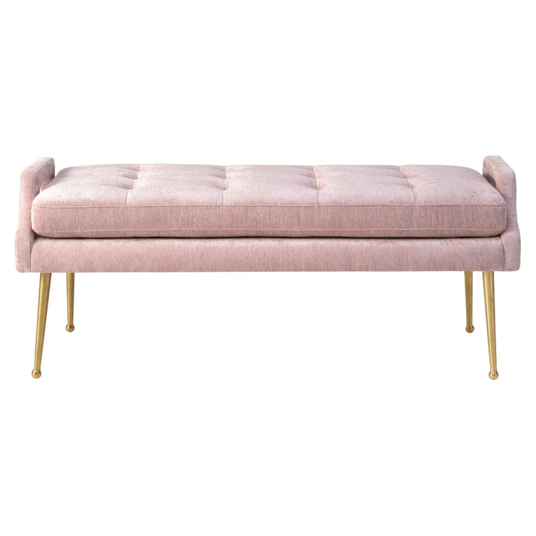 Be a trendsetter with the Deja Slub Velvet Bench. Featuring elegant gold legs and lush button tufting put this versatile bench in your entryway, living room, or bedroom. It will definitely get noticed. Available in a flirty blush and chic grey.