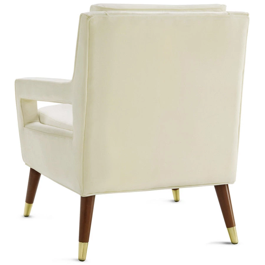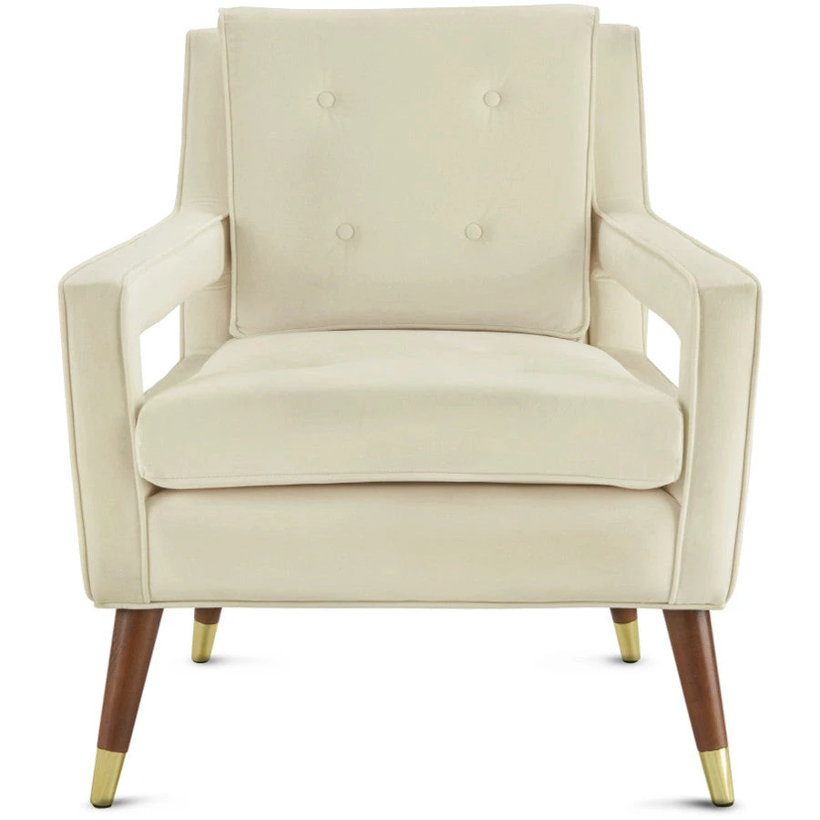 Mid-century design gets a fab remake with the Jasen chair. The brown beech wood conical shaped legs boast refined gold tipping, while the sumptuous velvet seat and back are button tufted.