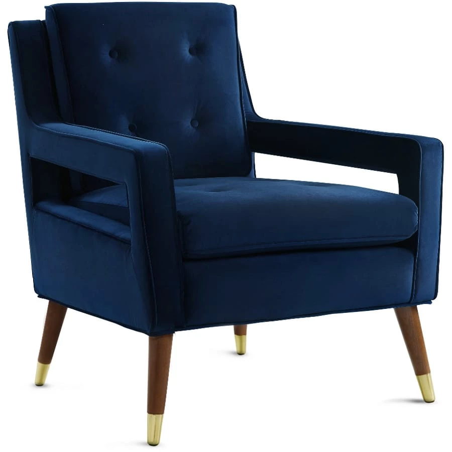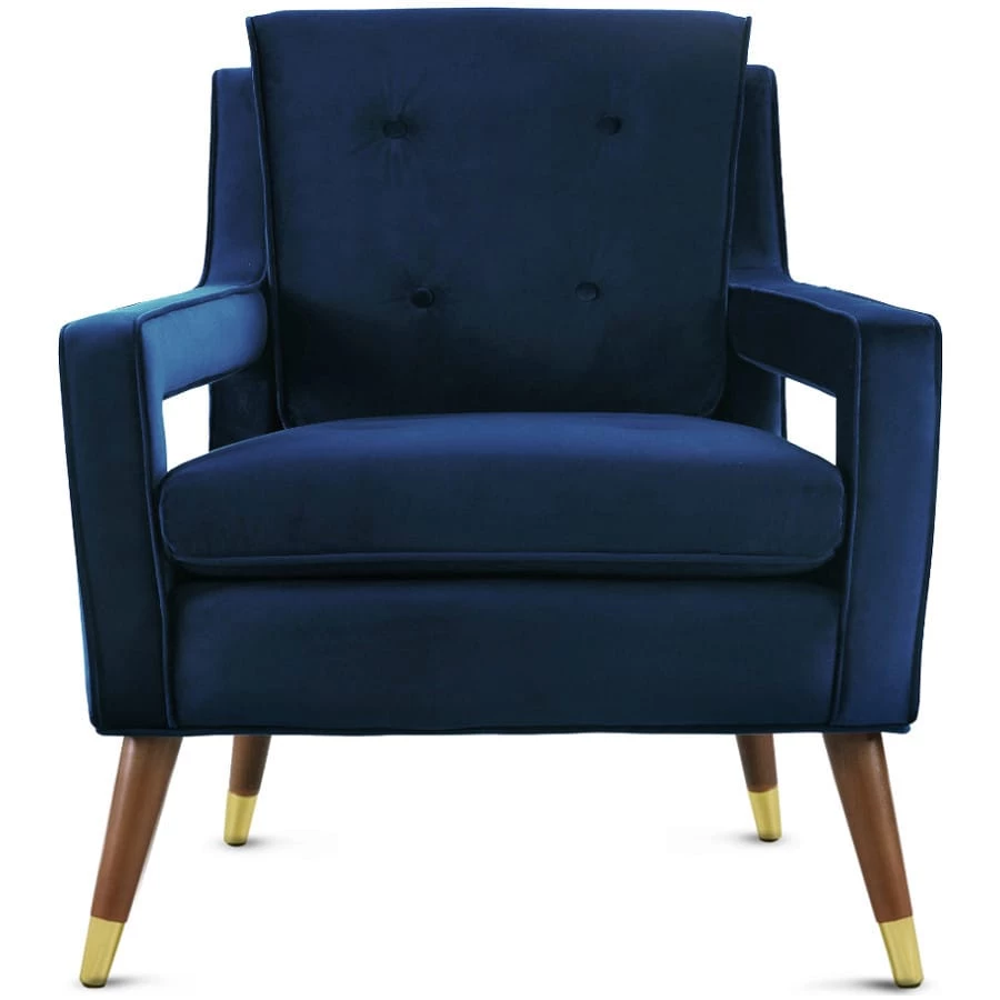 Mid-century design gets a fab remake with the Jasen chair. The brown beech wood conical shaped legs boast refined gold tipping, while the sumptuous velvet seat and back are button tufted.