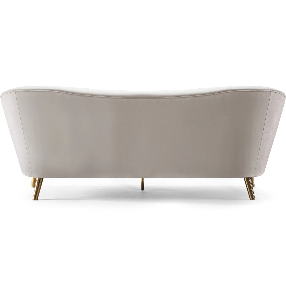 The versatile Minka sofa is upholstered in cream velvet set on a brushed gold base. For an inviting ultra chic approach place against a lively wall color.