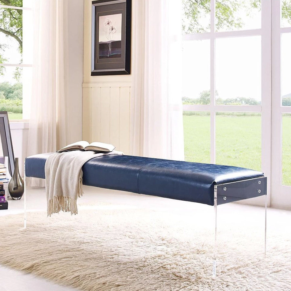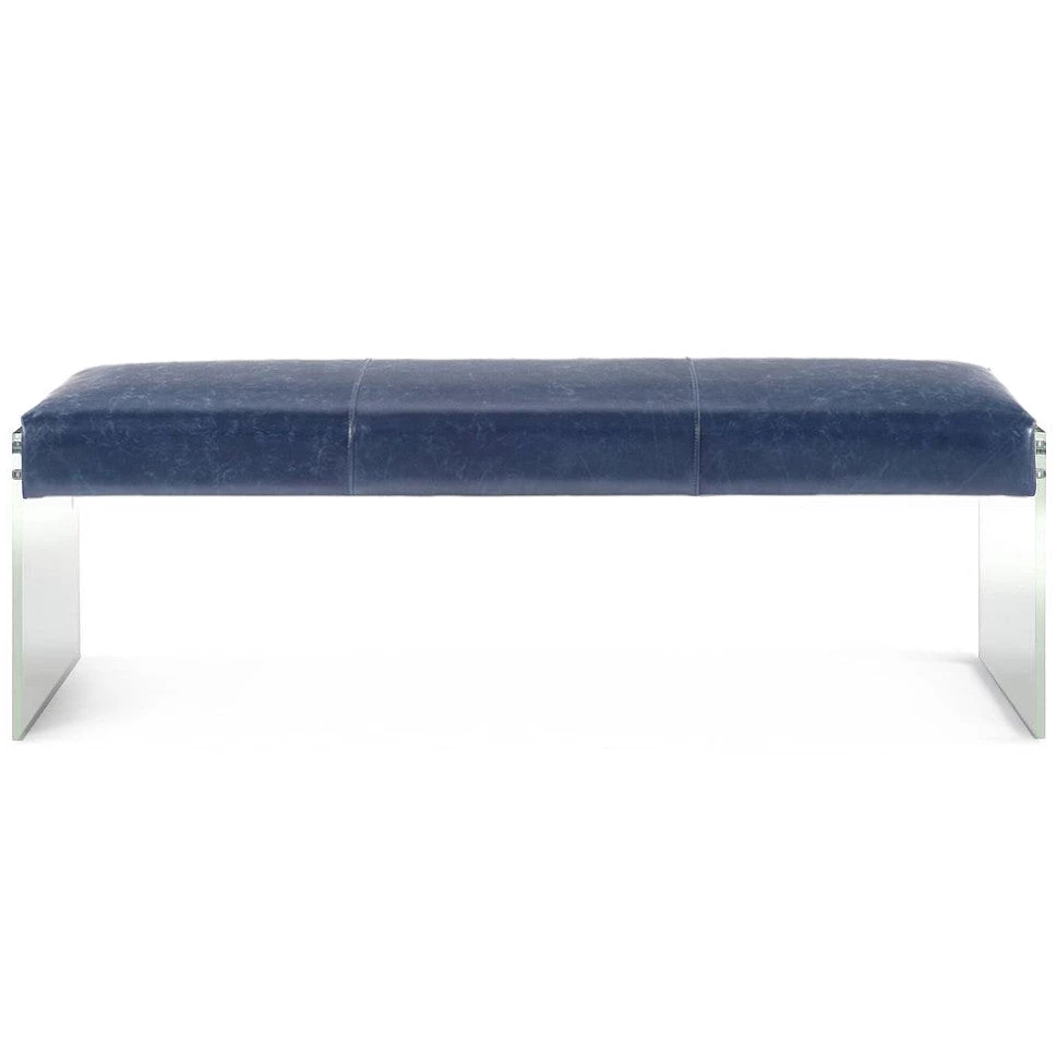 The Oscar Antique Blue Leather and Acrylic Bench exudes modern design and appeal. The clear acrylic legs offer a dramatic look to the simple shape, while the plush seat is upholstered in a soft bonded leather. This is a must have if you are looking to add eye catching style to any space.
