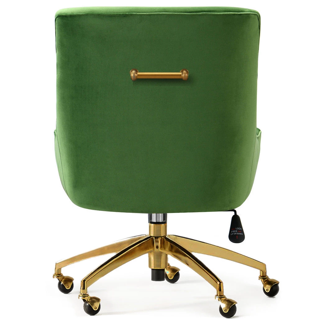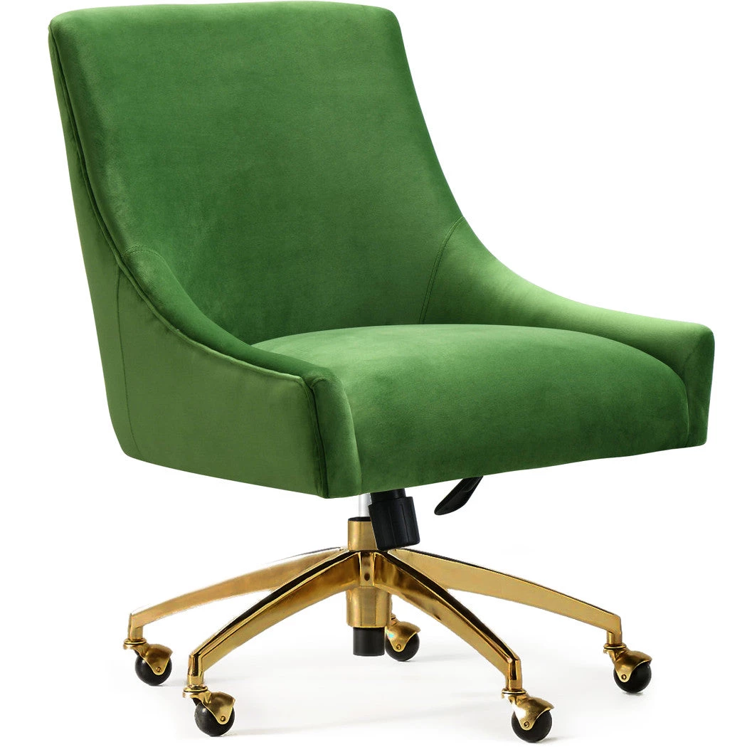 Featuring plush velvet upholstery, brass legs and a plump silhouette worth sinking into, this swoop arm design is perfect for pairing with your desk ensemble. With a 360 degree swivel and adjustable seating height, this office chair offers high style and high function for the hard working fashionista.