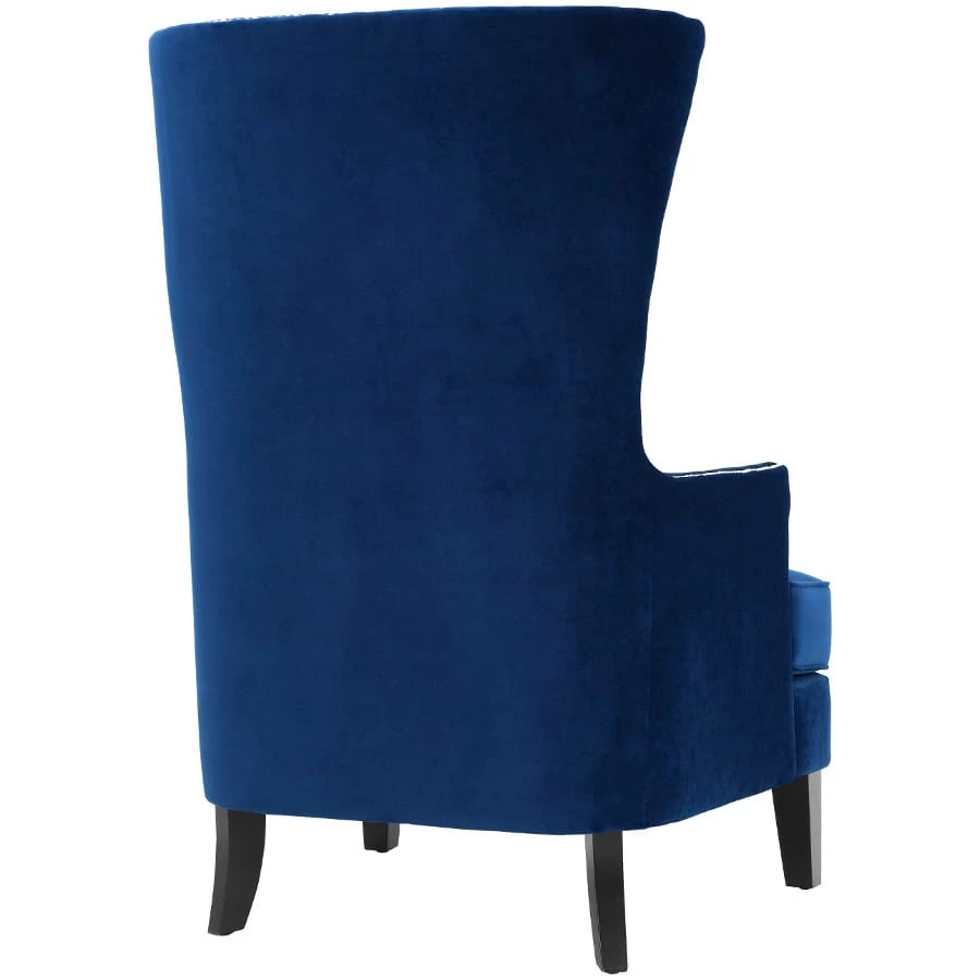 Wrap yourself in the regal Sophia winged chair. The high back, complemented by hand applied silver nail heads, convey a trim refined look. Upholstered in a deep navy blue velvet, crafted with solid kiln dried wood and dense foam support, the Sophia adds a commanding presence to any room.