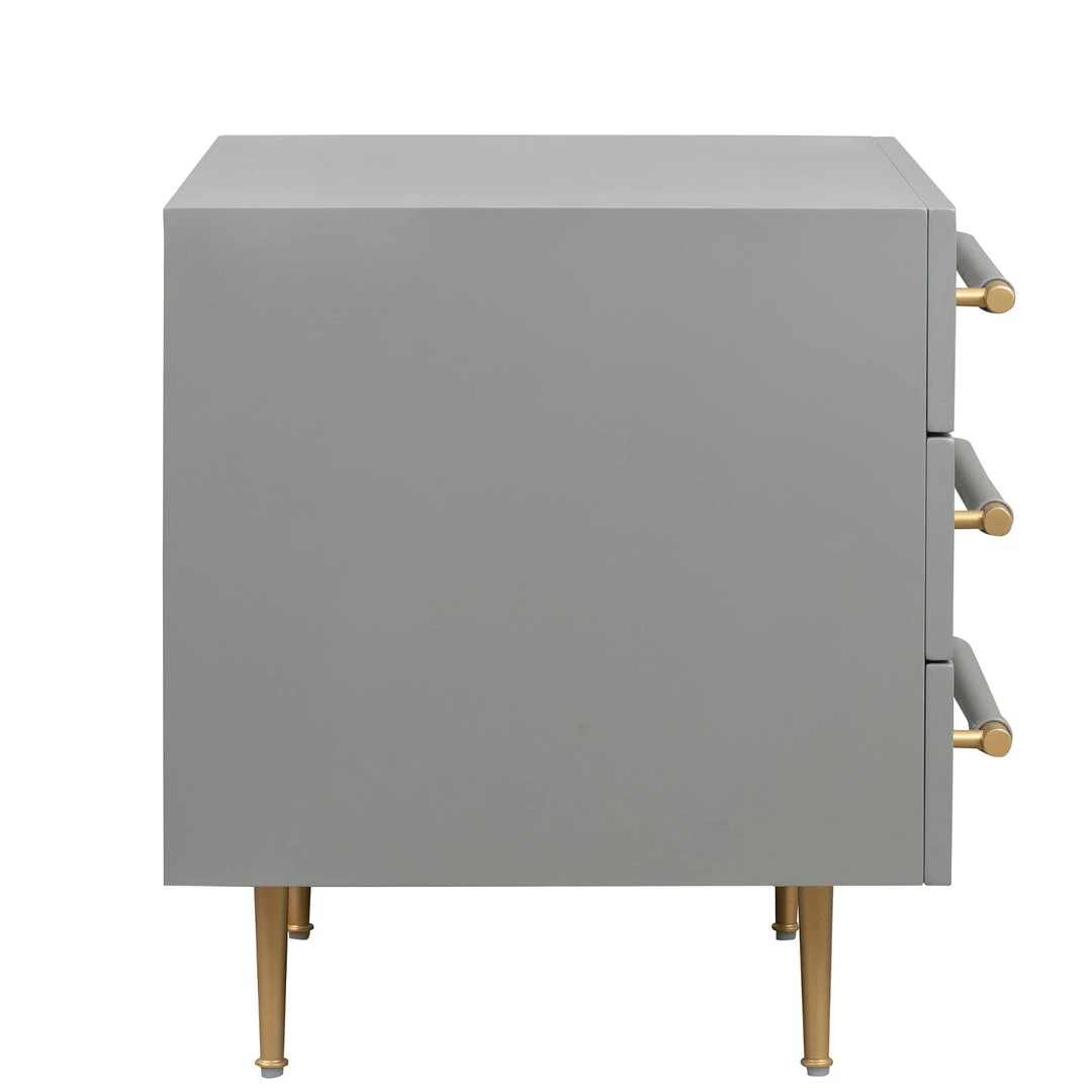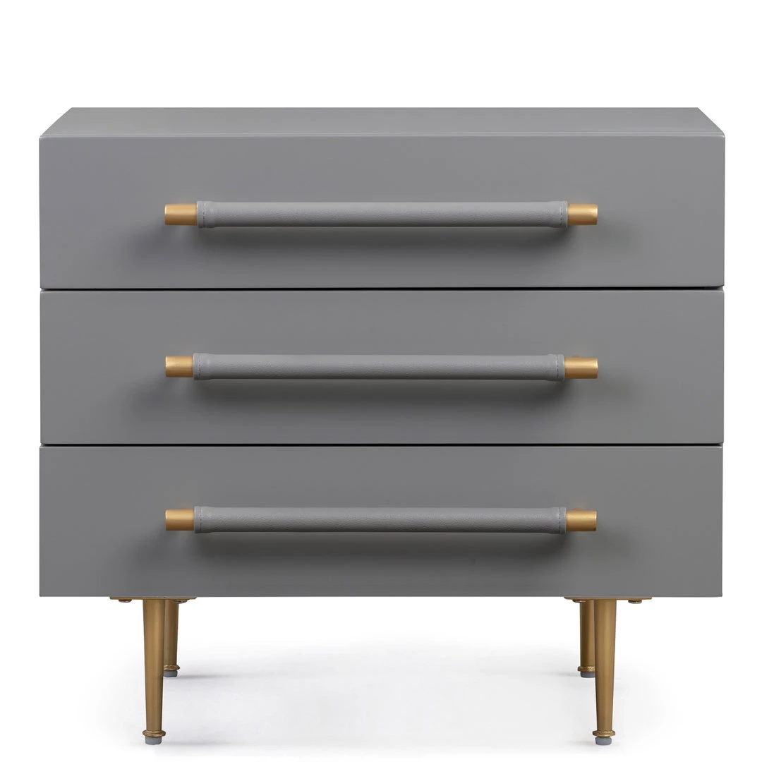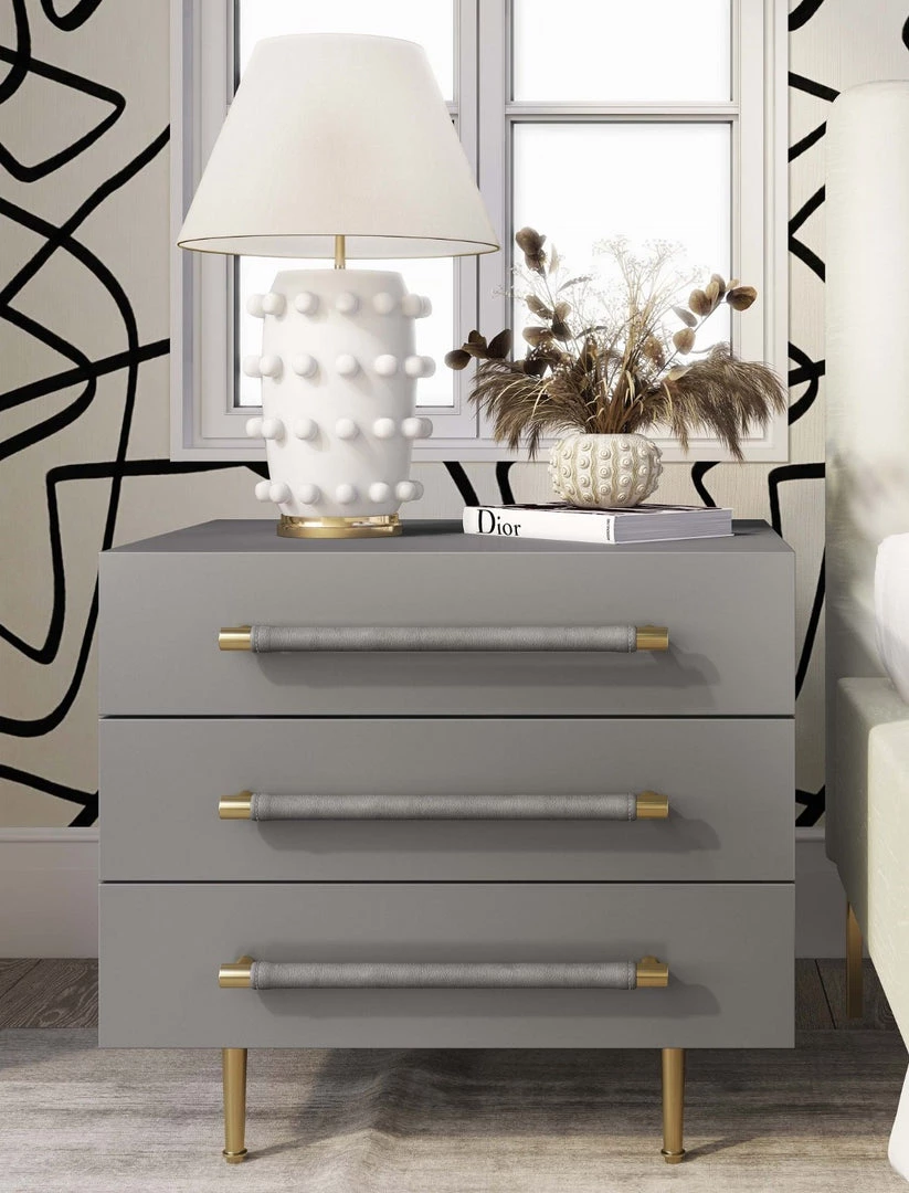 Lacquered in a sophisticated grey, this chic nightstand features brass-finished legs and vegan wrapped leather pulls for a beautifully modern material mix. With three soft-close drawers for storing nighttime essentials, Stride brings both style and function to the bedroom.
