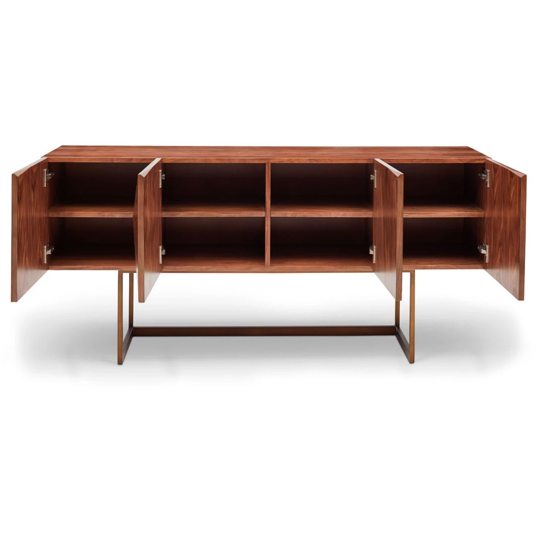 Calling attention to sleek lines and sculptural angles, the Micha Sideboard is truly multidimensional—its faceted doors open to reveal hidden storage space for table linens and other knick-knacks.