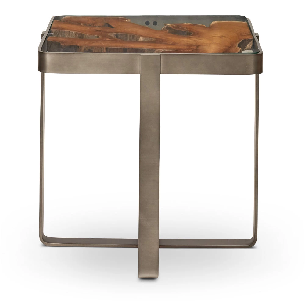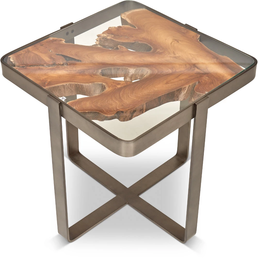 Bring a industrial organic vibe to your interior living space with the Kullen table. Its beautiful craftsmanship is characterized by a combination of galvanized gray steel encompassing free form teak wood with a clear glass top. A memorable piece, this table is sure to touch on your unique décor tastes for a lifetime.