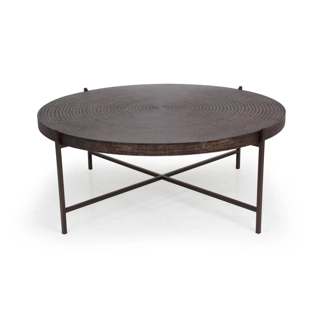 The Far East inspired Sanskrit coffee table is beautifully crafted from steel, copper, and a bronze steel base. The low lying Sanskrit’s distinctive top is finished with a hammered antique copper wood detail pattern on its surface.