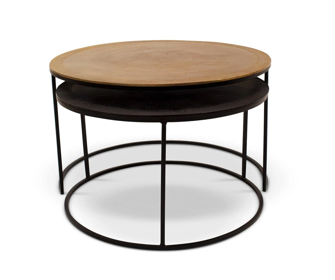 The Mandala tables are industrious with reclaimed aluminum and iron. Finished in Antique Brass, and complemented by the Bronze nesting table.