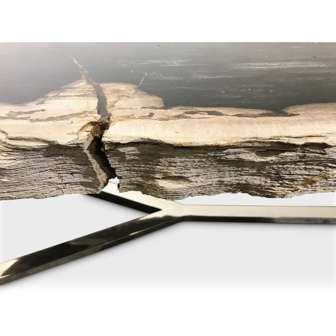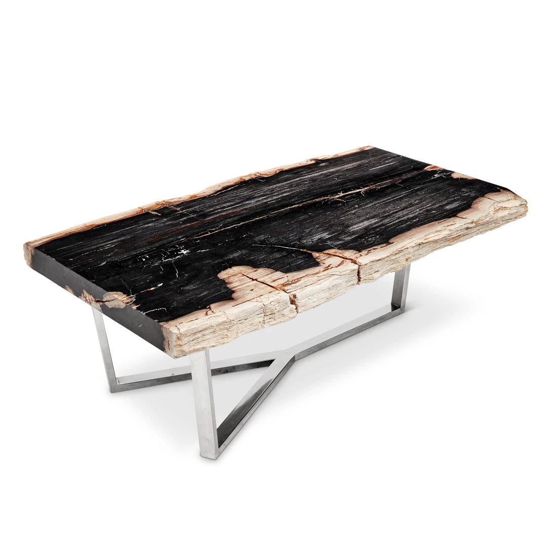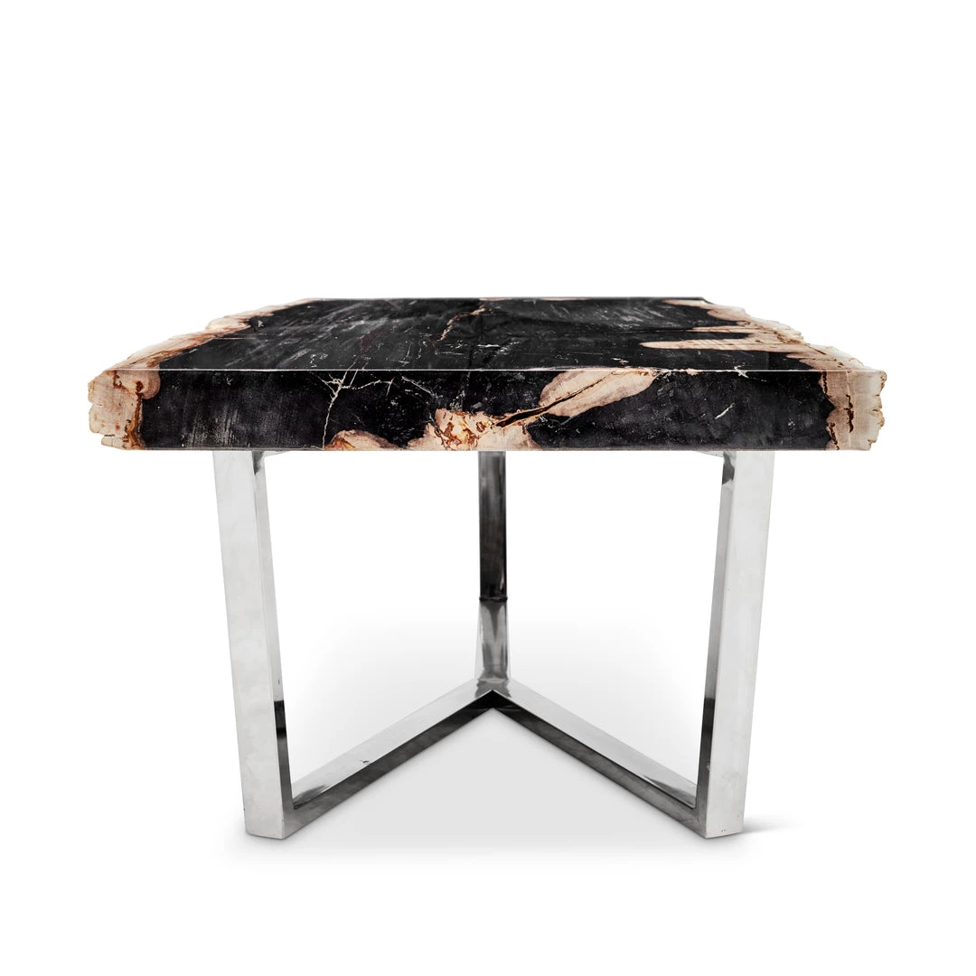 Materials: TOP- solid natural edge Petrified Wood Slab | BASE- Polished Stainless Steel