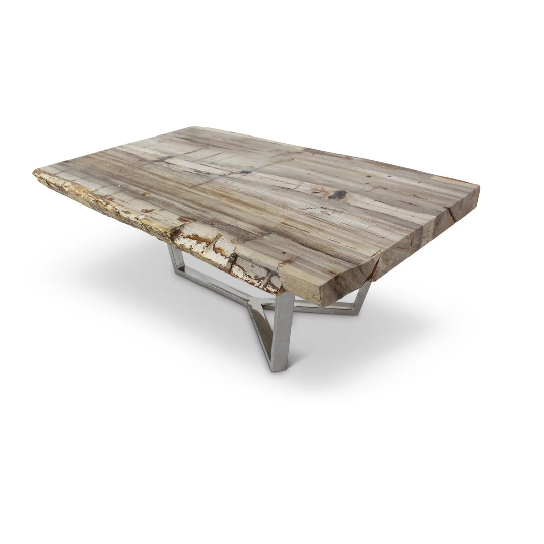 Materials: TOP- solid natural edge Petrified Wood Slab | BASE- Polished Stainless Steel