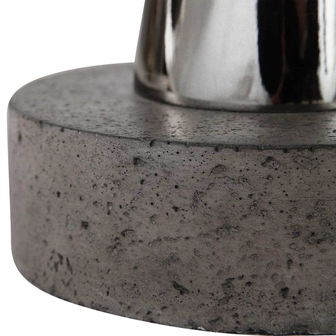 Mixed media styling, featuring a sleek black nickel finished base, complete with an aged concrete top and foot with strapping details and crystal accents.