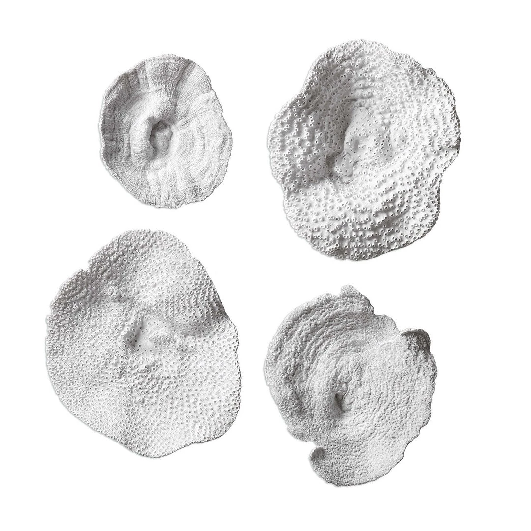 Heavily textured to mimic live sea coral and finished in antiqued white. These may be hung on a wall, with attached hangers, or displayed as table top accessories.