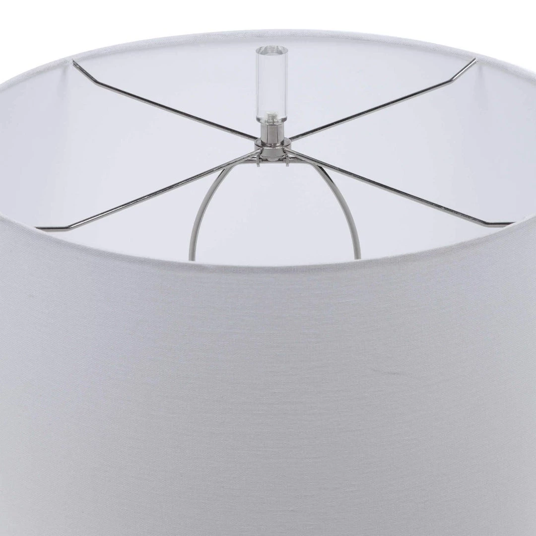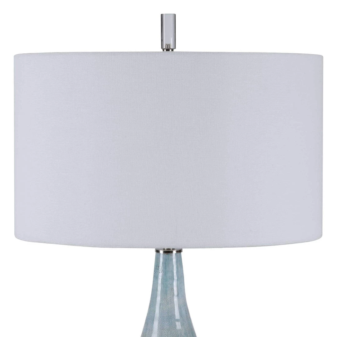 Showcasing a refined coastal style, this table lamp has a ceramic base finished in an aqua crackle glaze with touches of rust brown. Polished nickel and crystal accents highlight the design. The lamp is paired with a round hardback drum shade in a white linen fabric.