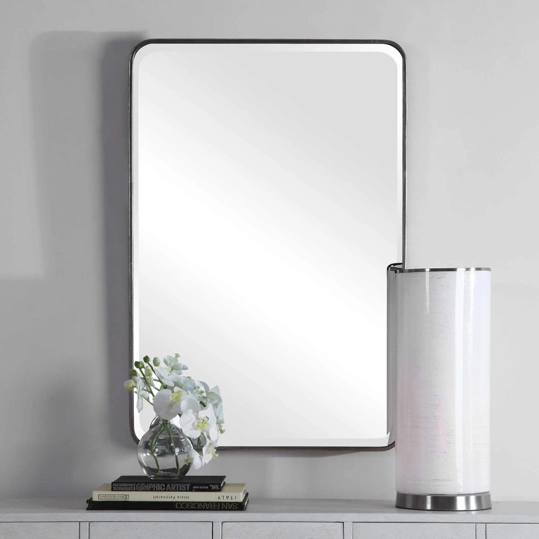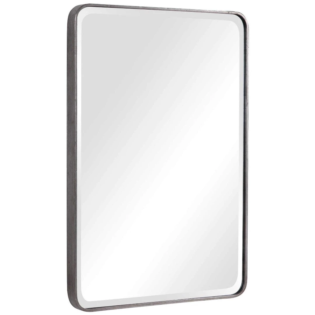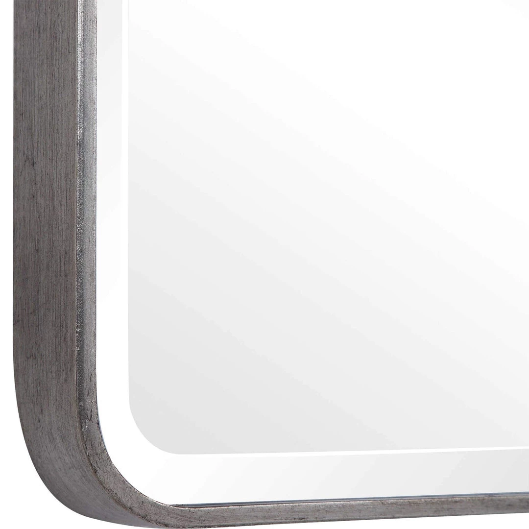 The iron frame is finished in lightly distressed silver leaf featuring gracefully curved corners, and a generous 1 1/4″ bevel.