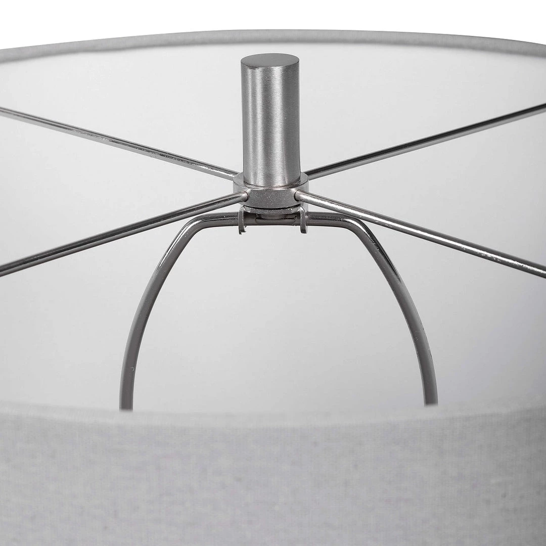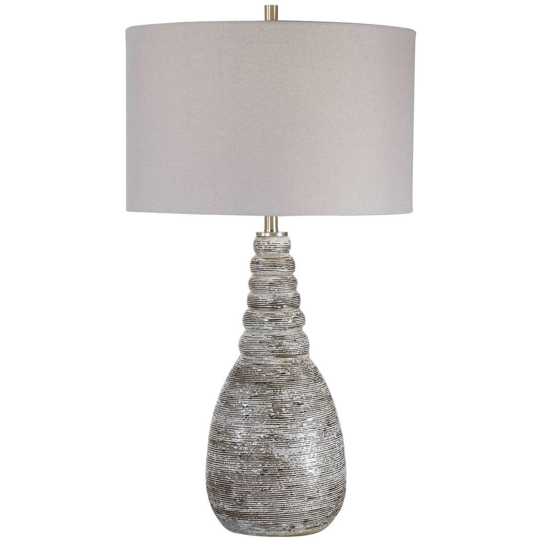 Displaying a unique shape, this ceramic table lamp showcases a noticeable ribbed texture finished in a distressed rust brown and subtle light gray crackle glaze, accented by brushed nickel details. The round hardback drum shade is a light gray linen fabric with natural slubbing.
