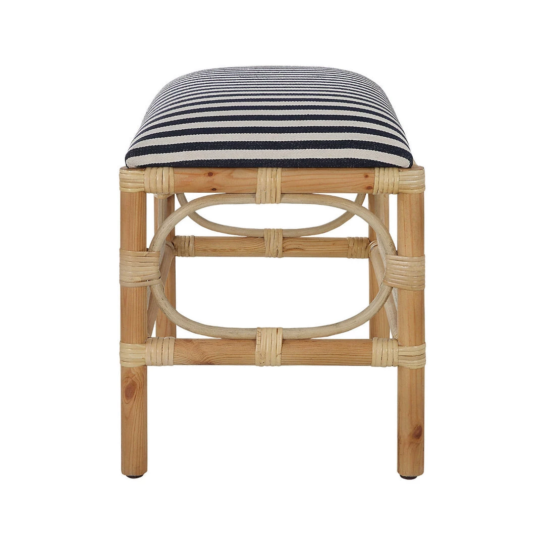 A refreshing coastal accent featuring a casual cotton blend navy and white striped seat, over a naturally finished solid wood base with rattan wrapped accents. Perfect doubled up at the foot of a bed or under a console table.