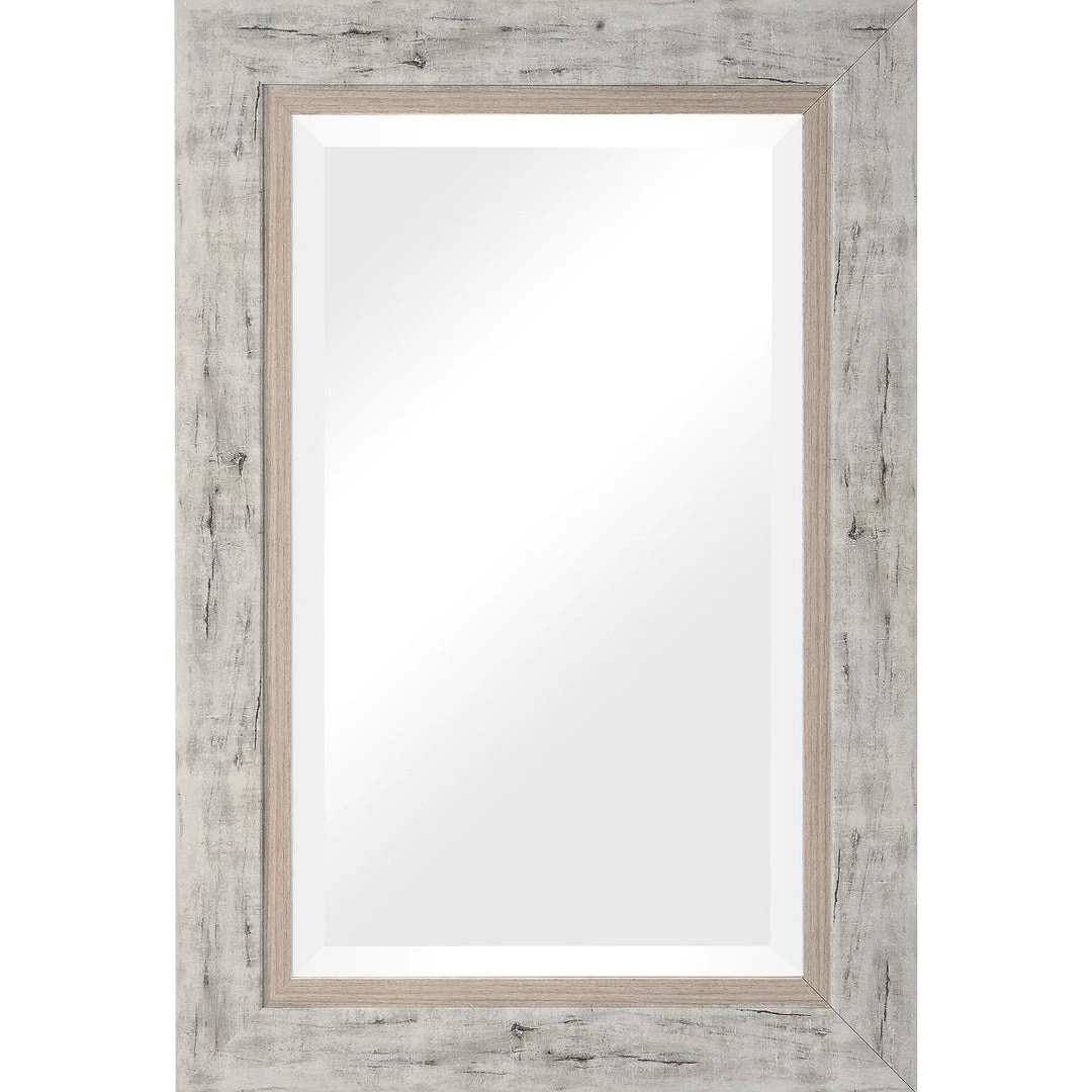Echoing the rustic lodge style, this mirror showcases a wrapped finish reminiscent of birch wood with hints of light gray, ivory, and charcoal. A light wood inner frame adds dimension to this large scale design. The mirror has a 1 1/4″ bevel.