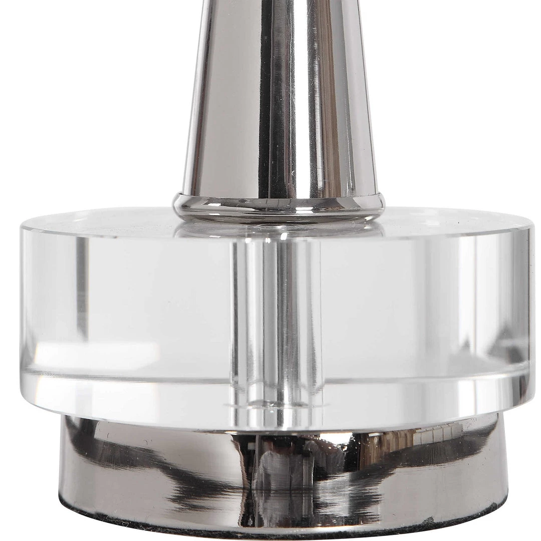 This clean and contemporary buffet design has an alternating polished nickel and crystal base that exudes modern elegance. The round hardback shade is a white linen fabric.