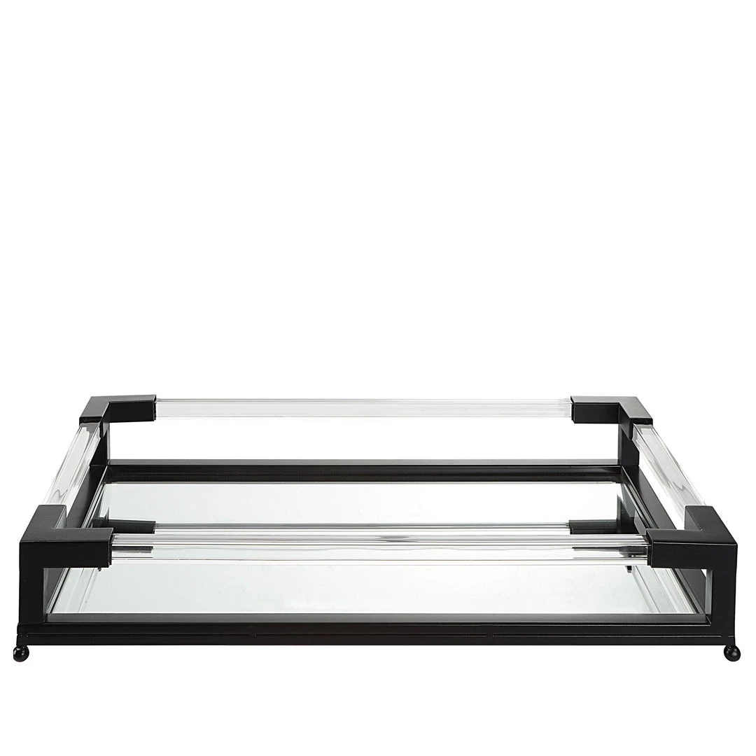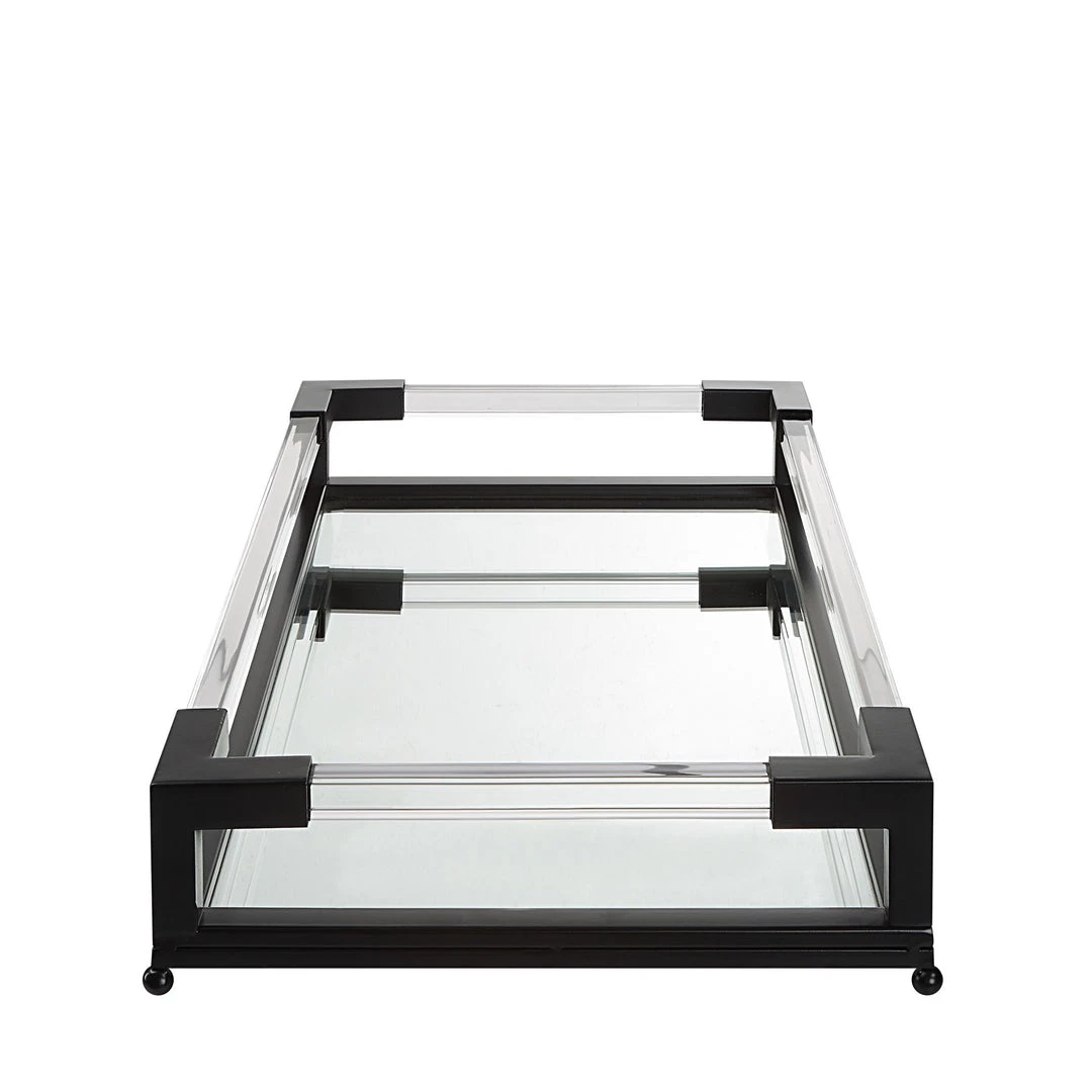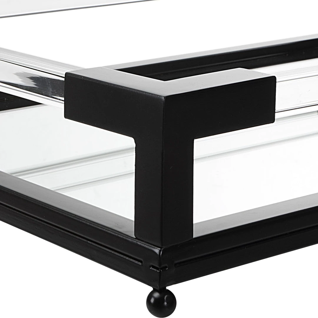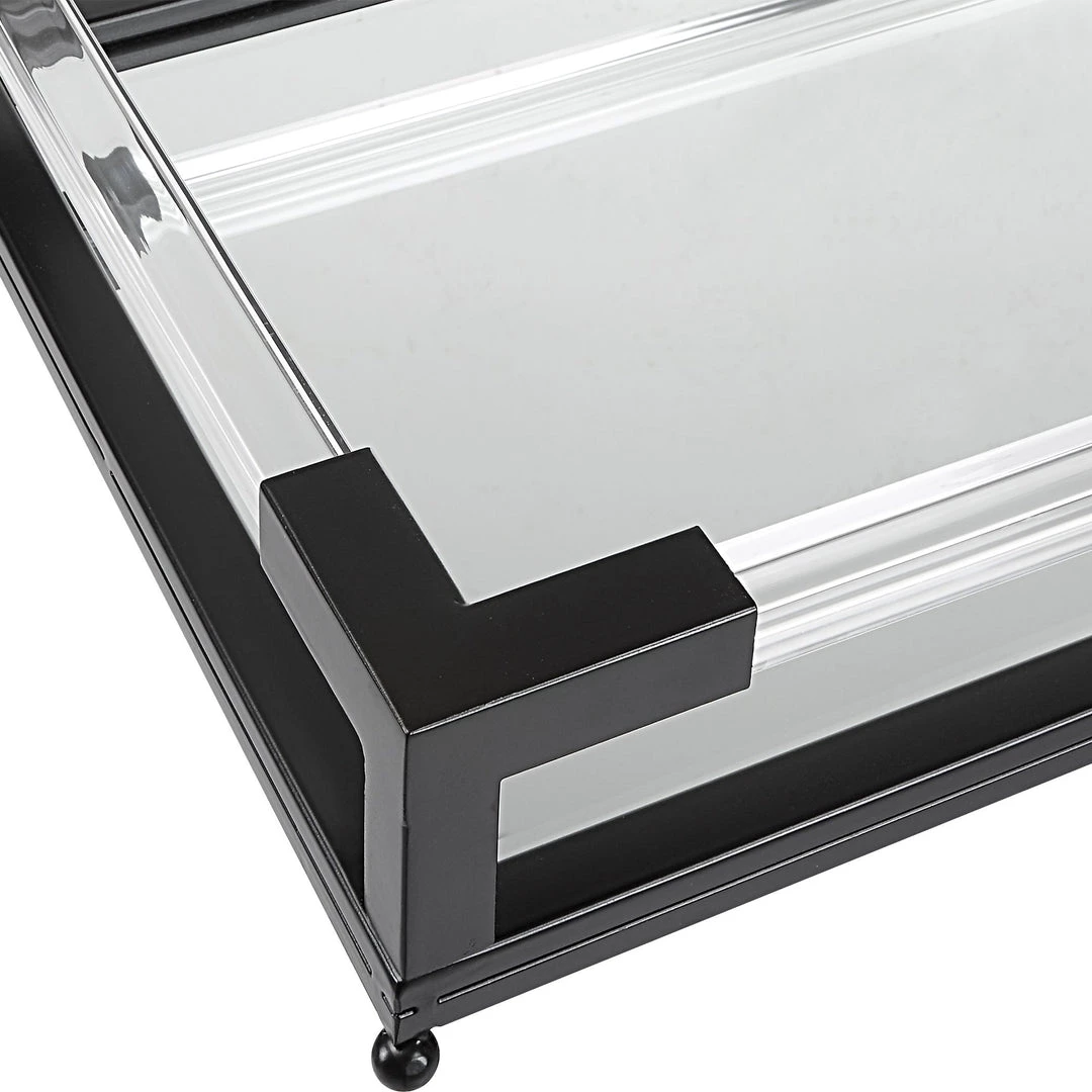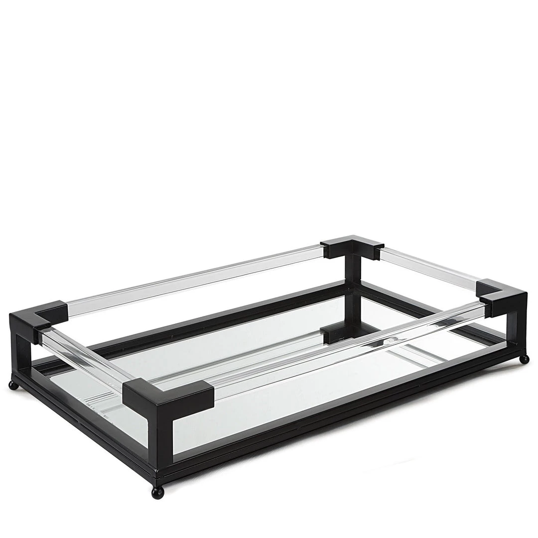 This modern serving tray features a hand forged iron frame finished in matte black connected with suspended solid acrylic bars. For added awesome, this tray has a beveled mirror interior perfect for reflecting your favorite objects.