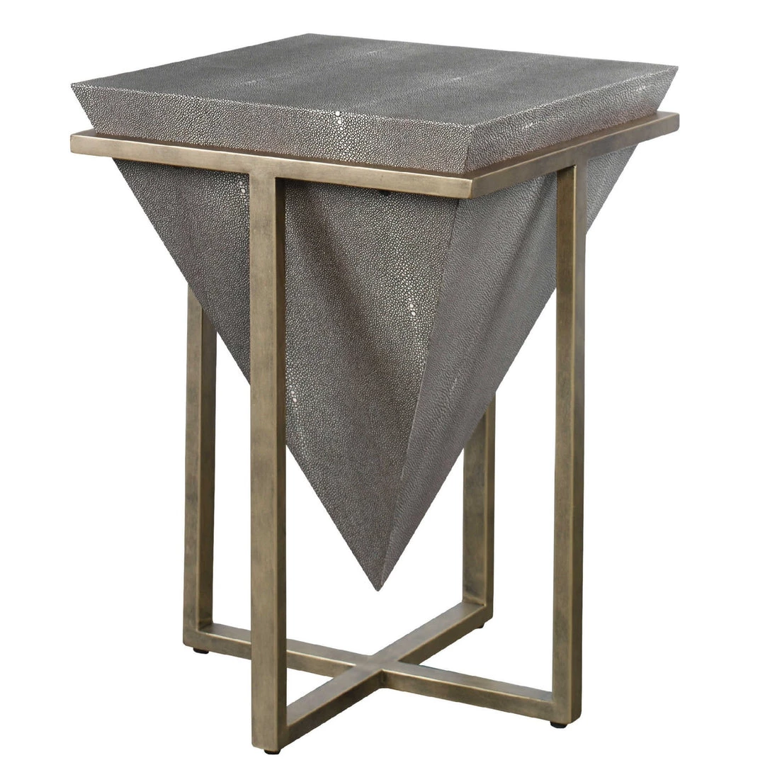 This upside down pyramid is finished in an elegant gray faux shagreen, nestled into an iron base finished in aged gold.