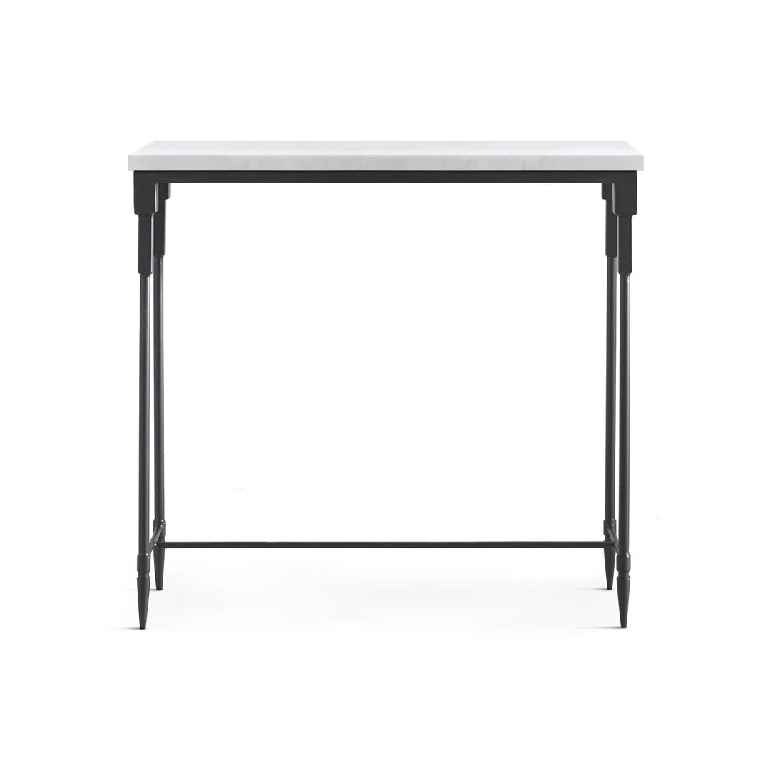 A classic black and white combination with transitional style, the Bourges console table features a honed white marble slab top with an iron base in satin black. Because of the natural characteristics of marble, each piece will have unique veining patterns.