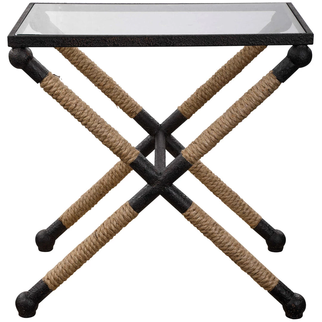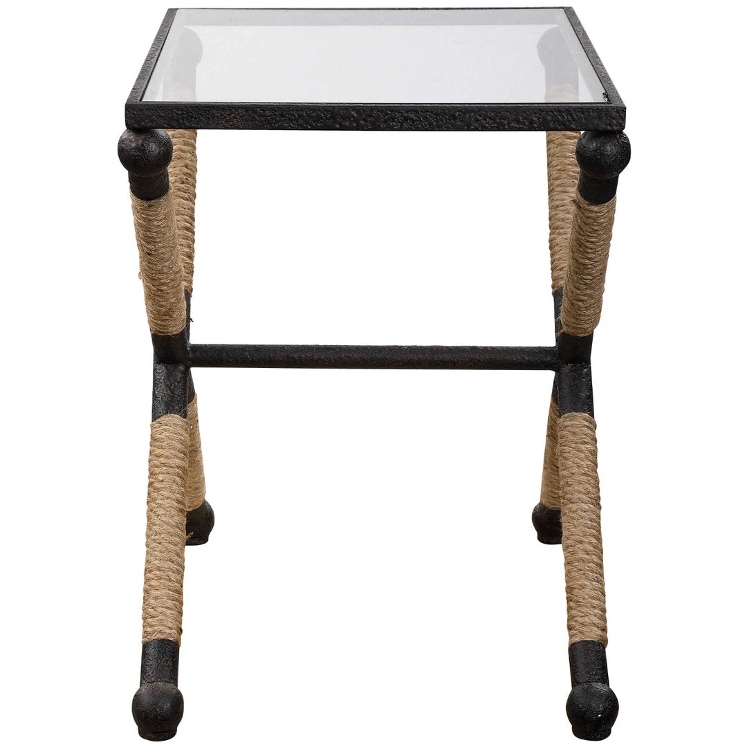 A nod to classic coastal style, this accent table features a rustic iron frame wrapped in natural fiber jute rope accents topped with clear tempered glass.