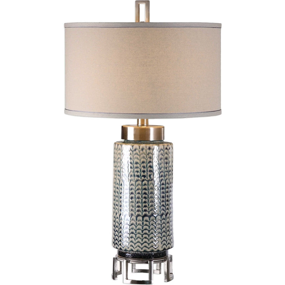 This ceramic lamp features a wavy, cerulean blue drip glaze, accented with natural ceramic undertones, and forged steel finished in a plated brushed nickel. The round hardback drum shade is a light beige linen fabric with coordinating thin double trim. Due to the nature of fired glazes on ceramic lamps, finishes will vary slightly.