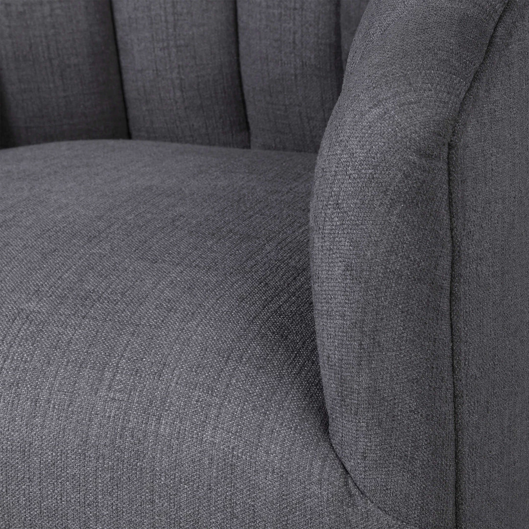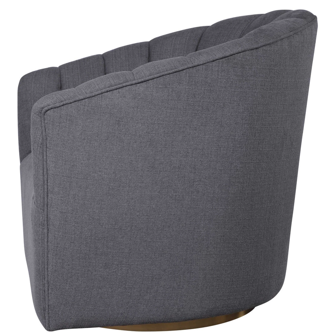Modern barrel back chair is covered in a light charcoal gray fabric with deep channel tufting and welt trimmed details. The stainless steel swivel base is finished in brushed brass.