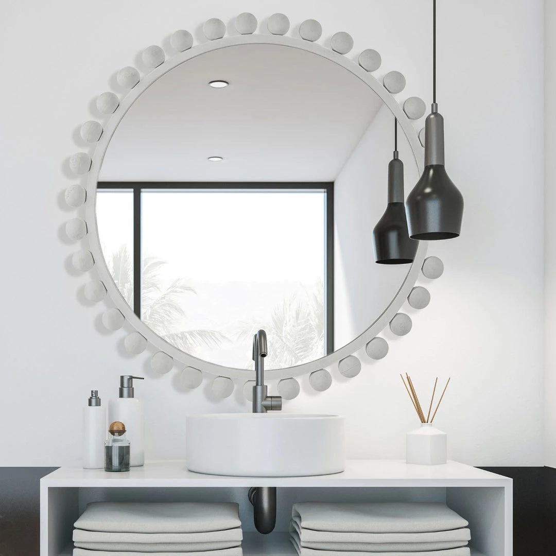 This eye-catching round mirror adds an upscale look and sophisticated style to any room by showcasing smooth iron spheres that embellish a sleek inner frame, finished in a clean matte white.