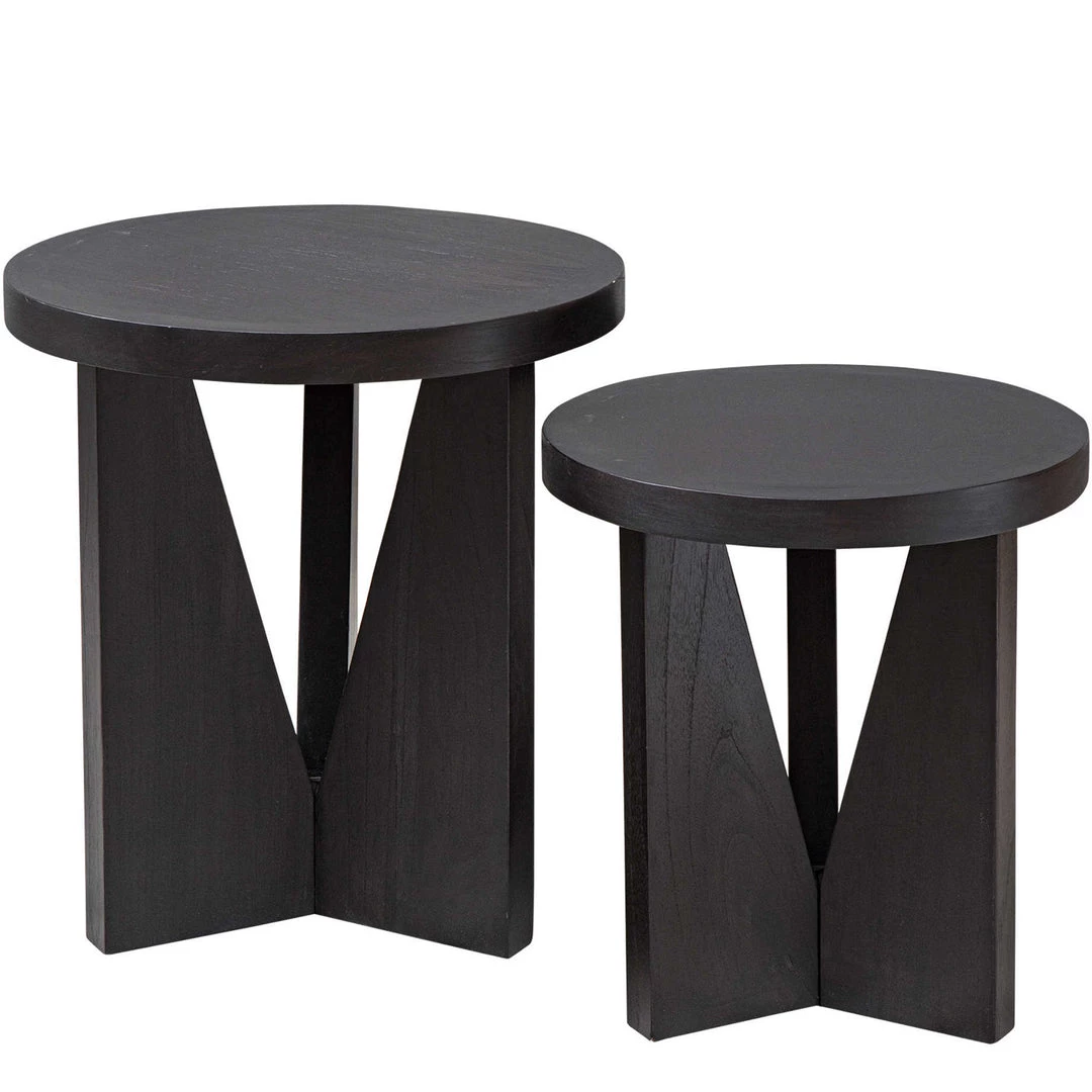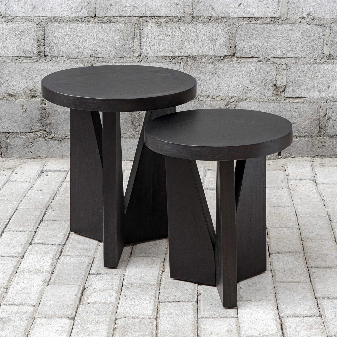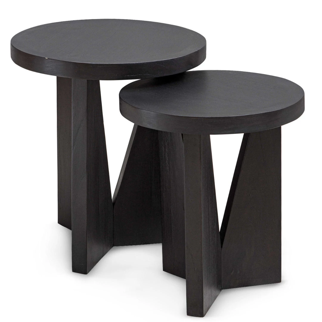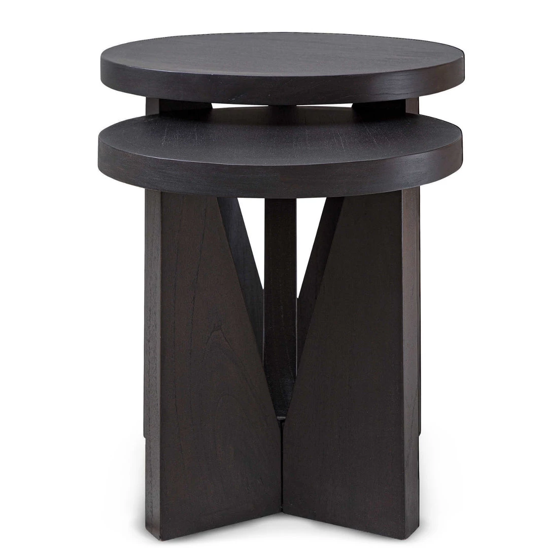 Modern and sophisticated, this set of two nesting tables features strong angular lines and is layered in dark espresso finished mindi veneer.