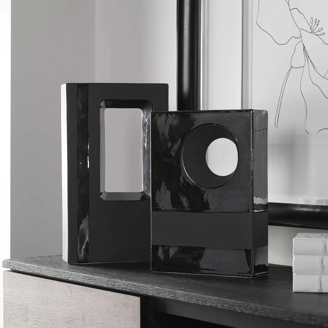 Perfect for styling bookcases, these modern earthenware blocks alternate matte gray glaze with gloss black for a minimalist geometric accent.