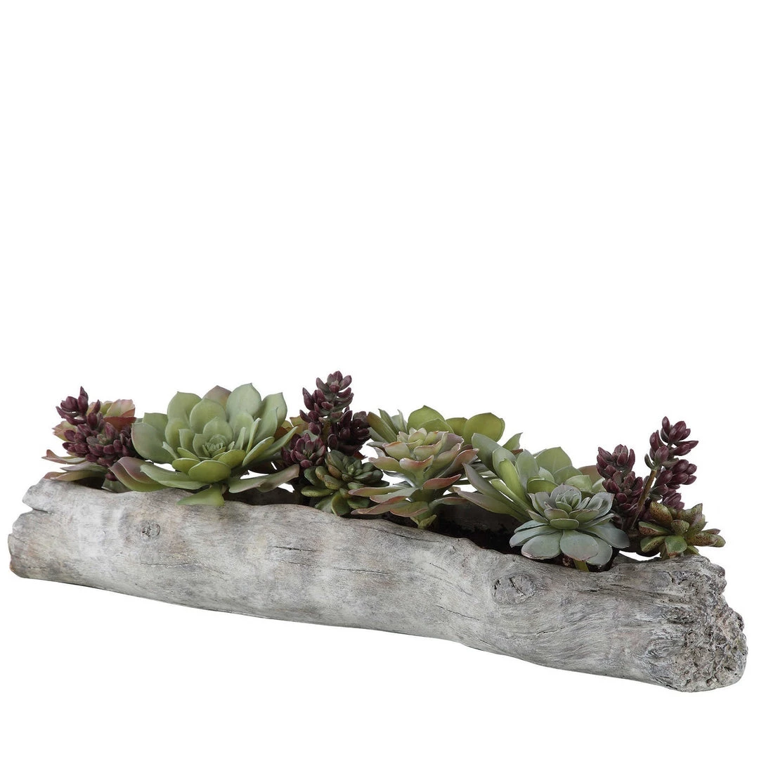 A lush mix of succulents in varying tones of greens and burgundy over a faux soil mixture, filling a solid concrete container resembling a life-like driftwood log.