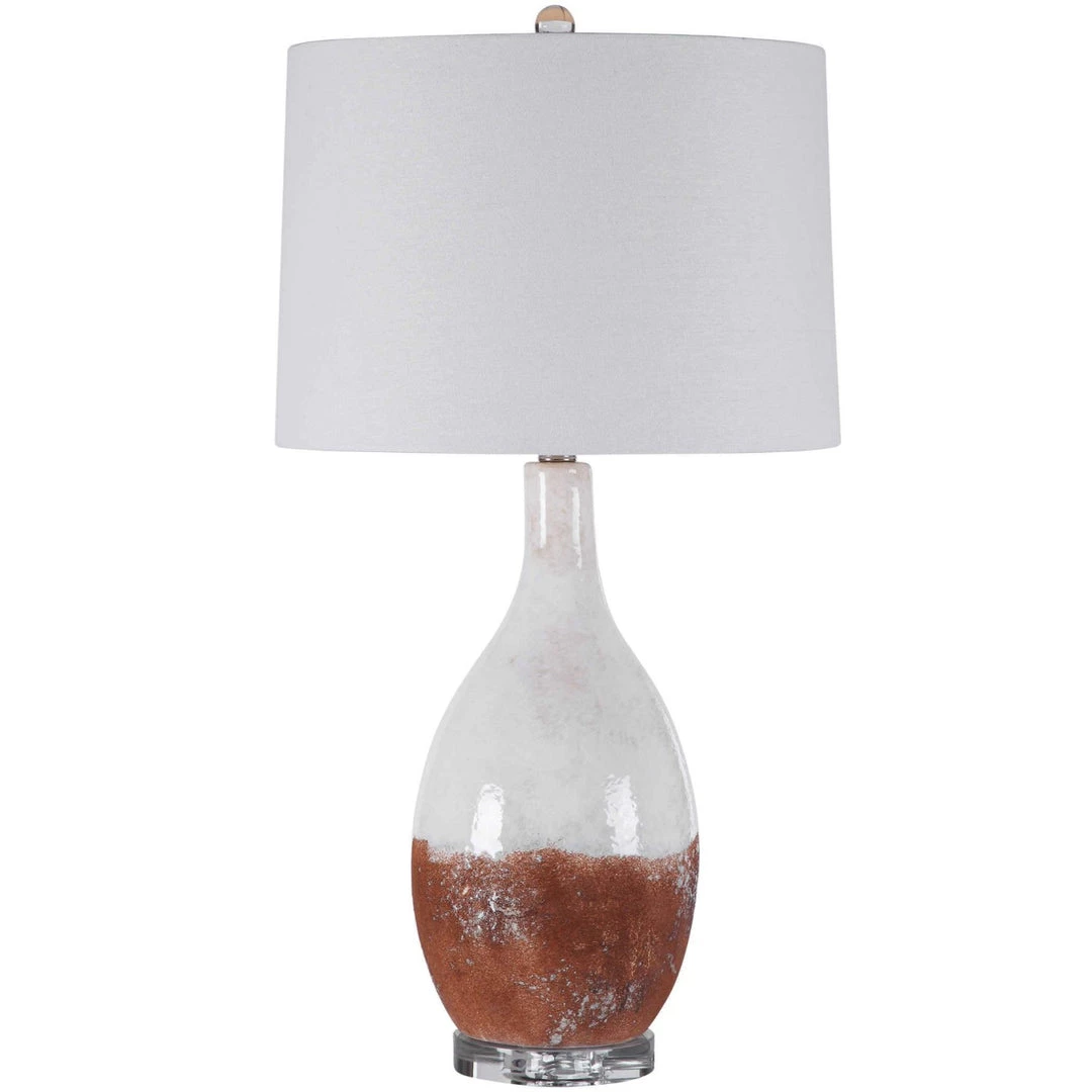 This table lamp features a ceramic base finished in an earthy terracotta rust that transitions into a crackled aged white glaze, accented with brushed nickel plated details and a thick crystal foot. The slightly tapered round hardback shade is a white linen fabric.
